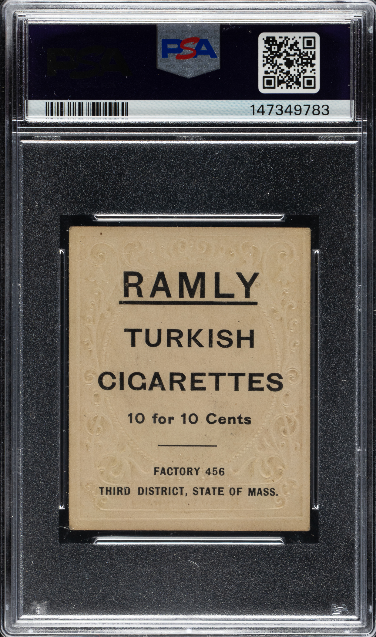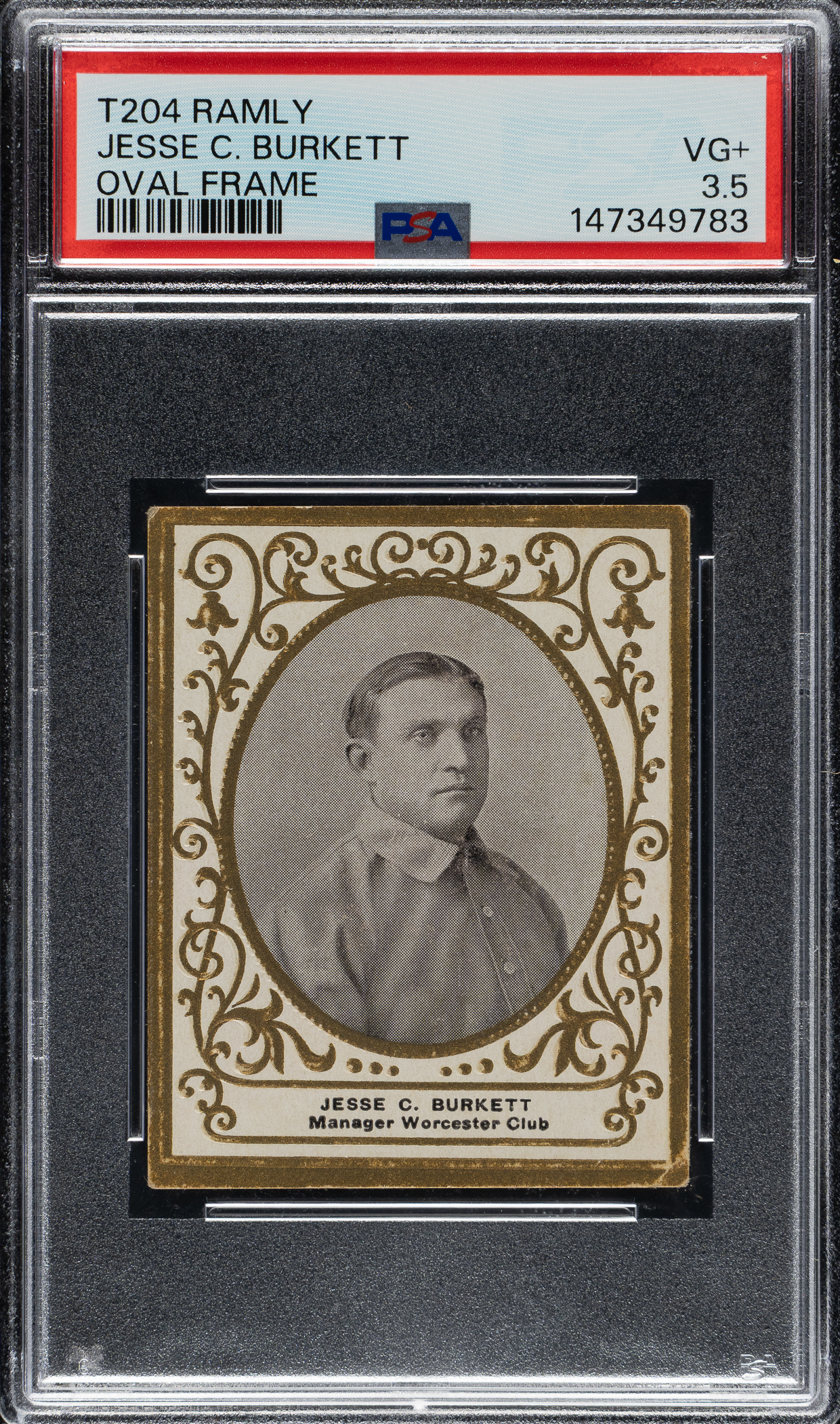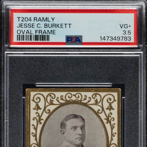 Graded VG+ 3.5 by PSA (submitted by REA). Incredible newly discovered example of one of the key Hall of Famers from the T204 Ramly series. Jesse Burkett is one of only 15 Hall of Famers in the set, which was produced in limited quantities and are thought to have been issued regionally in New England. This card is part of an exciting, fresh-to-the-hobby find of T204 Ramly cards that were saved by the family of the original owner who lived in the New England area, all consigned to REA's Spring 2026 and future auctions. In addition to being one of the most important cards in the set, this is arguably the most majestic of the very few cards ever issued of Burkett. His career spanned 16 years (1890-1905). During his career he batted over .400 three times, a feat duplicated only by Ty Cobb and Rogers Hornsby. After leaving the Major Leagues, Burkett owned and managed the Worcester club of the New England League (the team with which he is featured on this card) from 1906 to 1913, making regular appearances in the outfield until he was 45. The offered card has superb image clarity, honest corner wear, and light wear to the condition-sensitive borders. The reverse is boldly printed and entirely clean. This is a very attractive mid-grade example of one of the most important cards from this beautiful and extremely condition-sensitive set.
