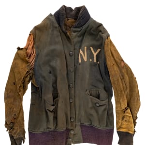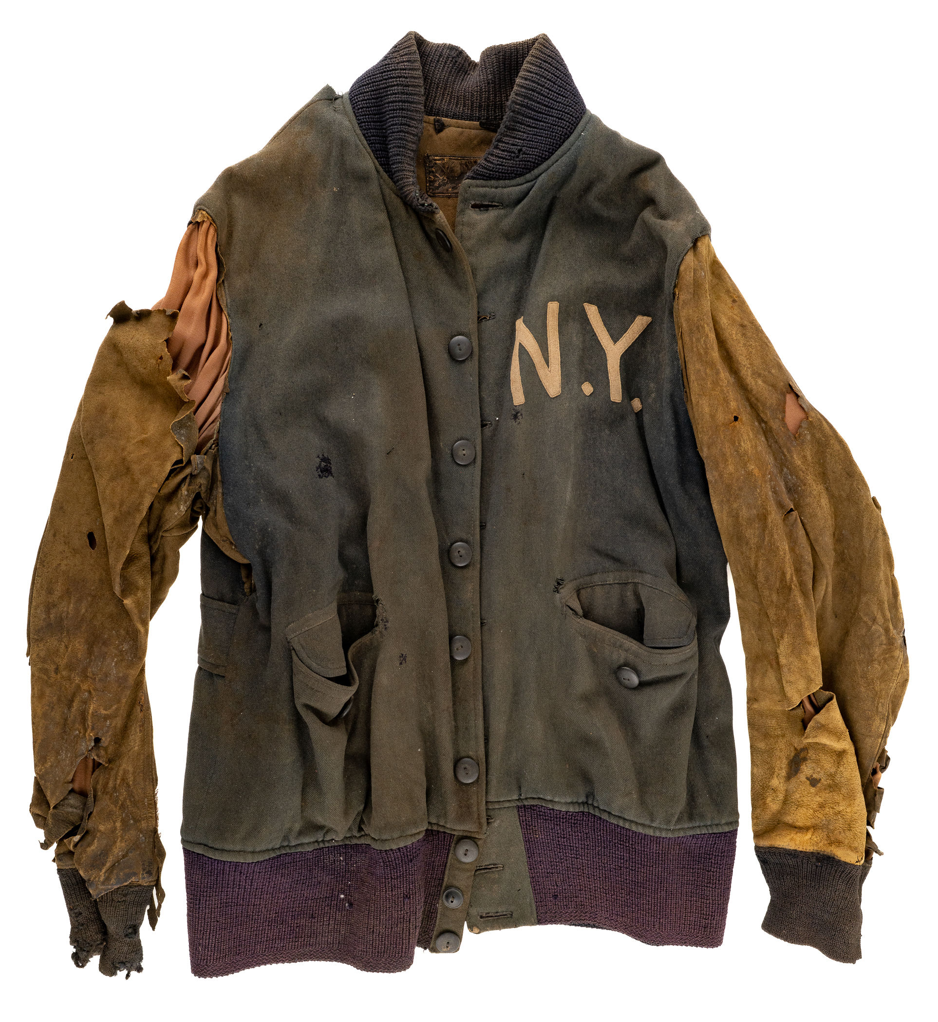 Rare New York Yankees team warmup jacket, circa 1928, worn by star pitcher Urban Shocker. This jacket, along with several other items offered in this auction, originates directly from Urban Shocker's estate and is accompanied by a signed letter of provenance from his great-grandson. The blue wool jacket, with button front, features leather sleeves and blue trim along the collar, cuffs, and waist. The "N.Y." logo appears in white felt on the left breast. Shocker's name, "U. J. Schocker," is chain-stitched in red on the interior right front tail. It is interesting to note that they misspelled his last name when preparing this garment. The manufacturer's label, which appears in the collar, is worn but remains intact. The jacket displays heavy wear commensurate with its age and former use, including numerous tears throughout (mostly the leather sleeves), and a number of small holes throughout. All 11 original buttons remain firmly attached (nine on the front; two on the pockets). Any and all Major League garments dating from the 1920s are exceedingly rare, especially outer garments such as jackets or sweaters. The Yankees purchased Shocker's minor-league contract from Ottawa of the Canada League for $750 in 1915. Shocker appeared in 12 games with the club in 1916, compiling a record of 4-3 with a 2.62 ERA. After spending a portion of the following season in the minors, Shocker was traded to the St. Louis Browns in 1918 in a deal that was supposed to bring Eddie Plank to the Yankees. Plank, instead, retired and the trade turned out to be one of the worst in Yankees history. Shocker blossomed into one of the League's best pitchers with St. Louis, winning 20 or more games each season from 1920 through 1923, including a league-high 27 wins in 1921. The Yankees, to their credit, realized the error of their ways and reacquired Shocker in 1925. Over the next three years, Shocker won 49 games for the "Bronx Bombers," including 18 in 1927. In 1928, Shocker appeared in one game before retiring. Unfortunately, later that year, he developed a bad case of pneumonia and eventually succumbed to the disease on September 9. He was only 37 years old. From 1920 through 1927, few pitchers could compare with Urban Shocker. Though he effectively began his career in an era that witnessed the introduction of the "live" ball, Shocker led all Major League pitchers in total victories during the five-year span 1920-1924. He finished his career with an impressive record of 187-117, a .615 lifetime winning percentage, and an ERA of 3.17. Despite the condition of the jacket, this is one of the most incredible New York Yankees game-used relics from the 1920s that we have ever had the privilege of offering!