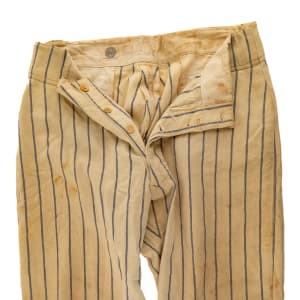 Pair of New York Yankees home flannel baseball pants worn by star pitcher Urban Shocker circa 1926. These pants, along with several other items offered in this auction, originate directly from Urban Shocker's estate and is accompanied by a signed letter of provenance from his great-grandson. The white pinstripe flannel pants feature the size "Extra - 36" chain-stitched in white along the waistband. Also located in the waistband is a "Spalding" label. The pants are all original, with no alterations, and display significant wear, including moderate soiling and a team repair on the left leg.
