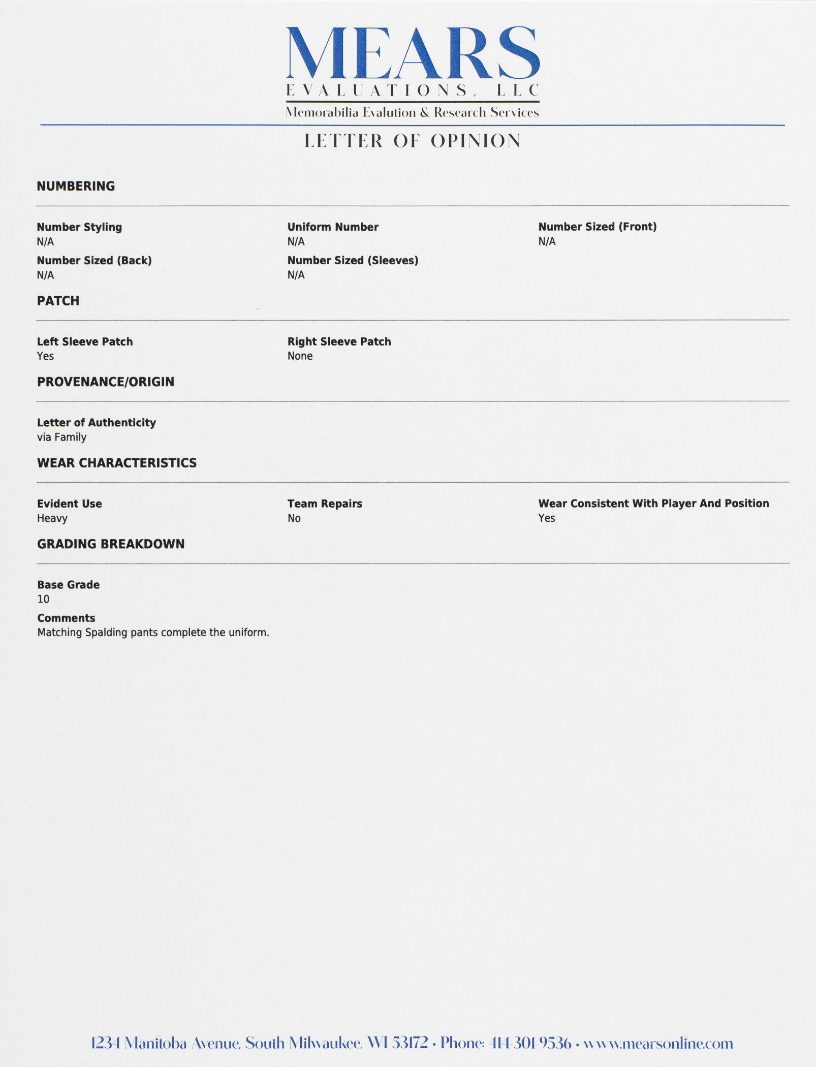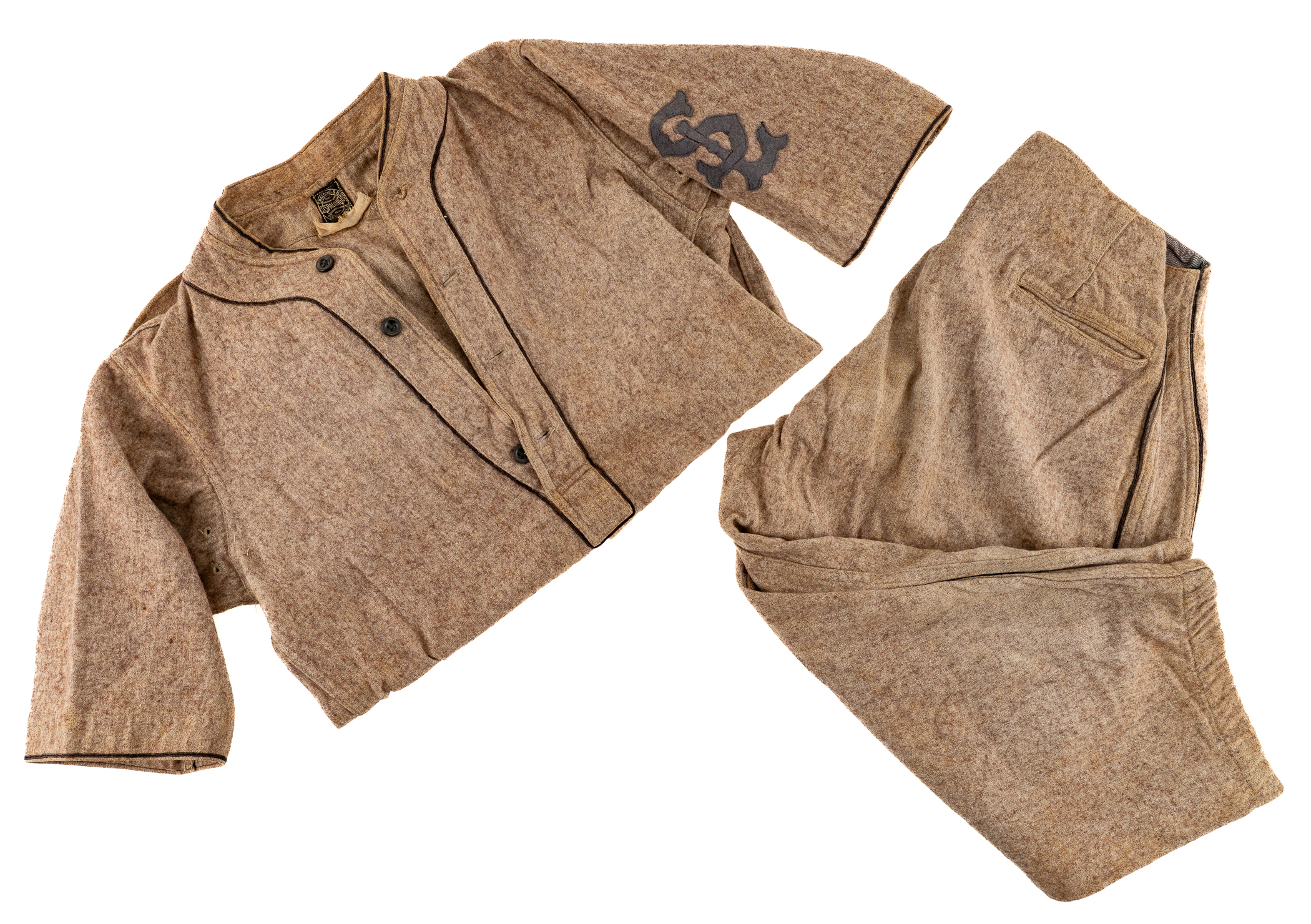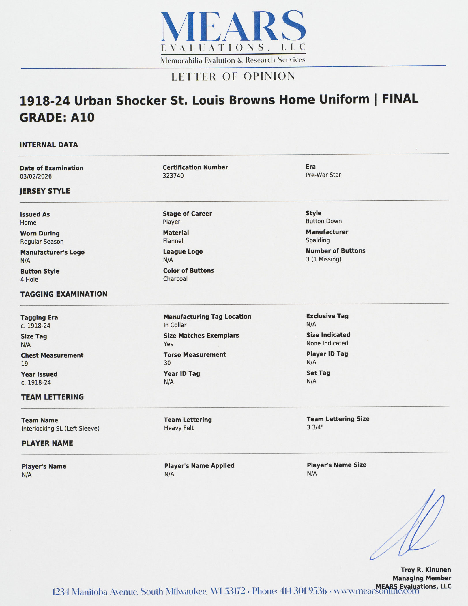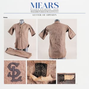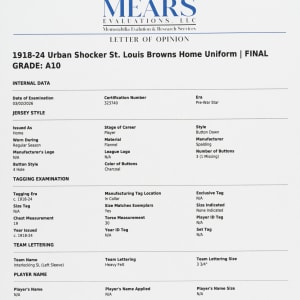 Exceedingly rare St. Louis Browns home uniform (jersey and pants) worn by pitcher Urban Shocker during the late teens to early 1920s. Graded A10 by MEARS. This might be the earliest St. Louis Browns jersey still in existence, as we have never seen another that predates it. It also enjoys the unique provenance of originating from a family member of pitcher Urban Shocker, who was a key member of the 1927 New York Yankees. The uniform is one of a number of items consigned to this auction by Shocker's great-grandson (the remainder of the collection, which includes photos, game-used equipment, and other such items, is offered elsewhere in this auction). The cream-colored button down flannel jersey, which predates uniform numbers, features the team's interlocking "SL" logo on the left sleeve in heavy felt. Located in the collar is a "Spalding" label. A white tag with no markings is in the collar as well. The garment is original as issued, with no alterations, and according to the MEARS LOA, it displays heavy wear, including one missing button. The matching cream-colored flannel pants feature a "Spalding" label in the waistband. Also located in the waistband is a white tag with no markings. The pants are heavily worn and have light staining throughout. Shocker spent seven seasons (1918-1924) with the Browns. He finished his 13-year career in 1928 with an impressive record of 187-117, a .615 lifetime winning percentage, and an ERA of 3.17. The offered uniform is exceptional in all respects, especially with regard to provenance and would make a substantial addition to any advanced collection. Graded A10 by MEARS (base grade of 10, with no deductions). Full LOA from MEARS. The uniform is accompanied by a large-format studio presentation photograph featuring Shocker wearing the same style uniform as the one being offered. The photographer, "Sid Whiting," has signed the photo in the lower right. The photo (13 x 19 inches) has a number of edge tears, including a large one in the center (repaired with tape on the reverse), and a small chip on the top edge. Fair condition. Total: 3 items (jersey, pants, and photo).