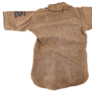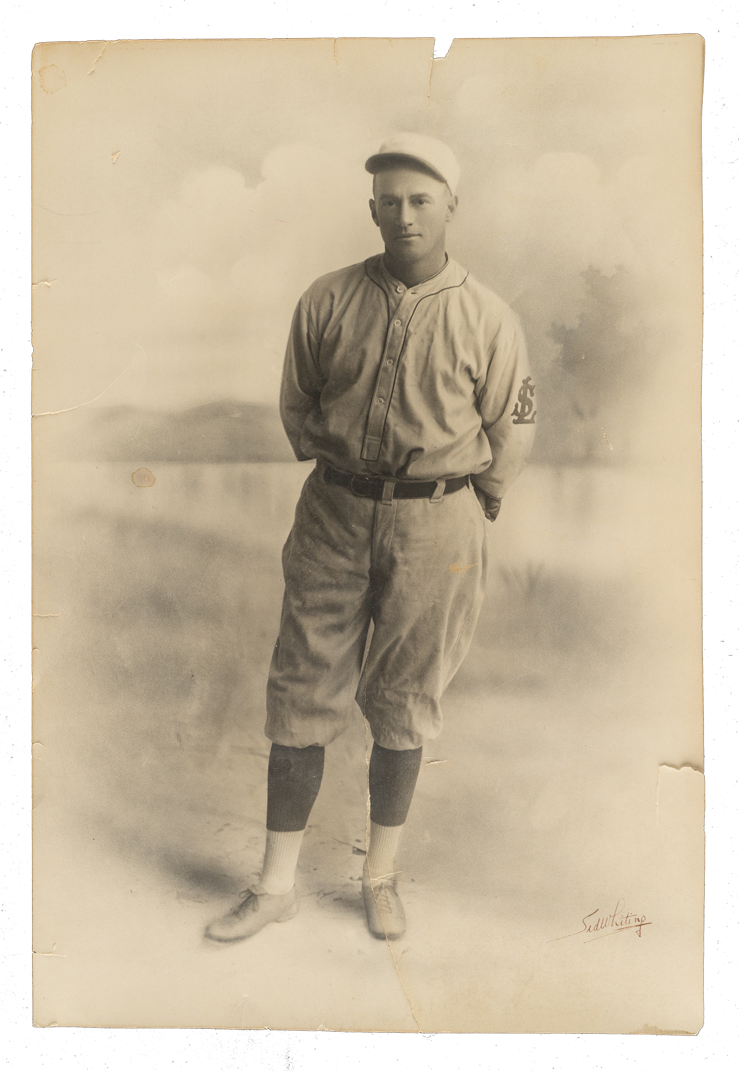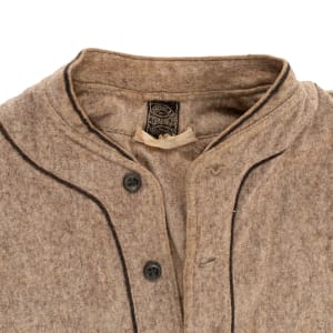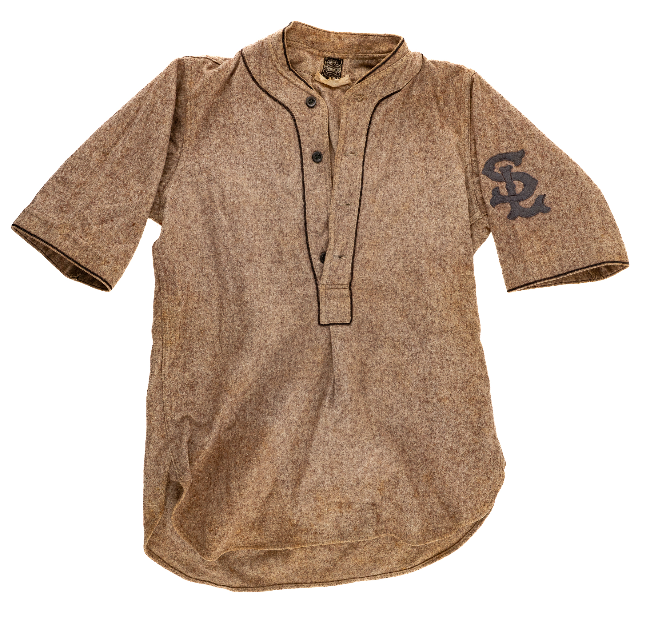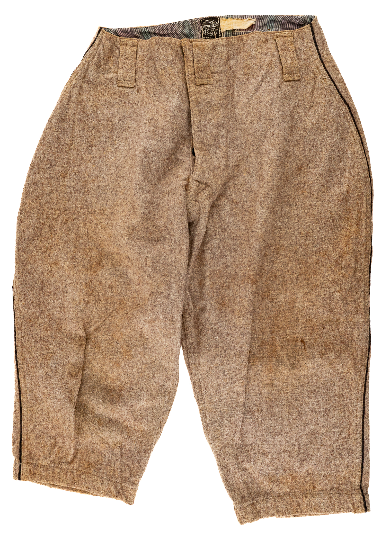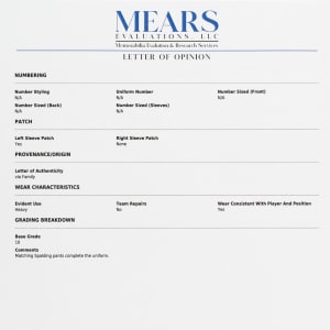 Exceedingly rare St. Louis Browns home uniform (jersey and pants) worn by pitcher Urban Shocker during the late teens to early 1920s. Graded A10 by MEARS. This might be the earliest St. Louis Browns jersey still in existence, as we have never seen another that predates it. It also enjoys the unique provenance of originating from a family member of pitcher Urban Shocker, who was a key member of the 1927 New York Yankees. The uniform is one of a number of items consigned to this auction by Shocker's great-grandson (the remainder of the collection, which includes photos, game-used equipment, and other such items, is offered elsewhere in this auction). The cream-colored button down flannel jersey, which predates uniform numbers, features the team's interlocking "SL" logo on the left sleeve in heavy felt. Located in the collar is a "Spalding" label. A white tag with no markings is in the collar as well. The garment is original as issued, with no alterations, and according to the MEARS LOA, it displays heavy wear, including one missing button. The matching cream-colored flannel pants feature a "Spalding" label in the waistband. Also located in the waistband is a white tag with no markings. The pants are heavily worn and have light staining throughout. Shocker spent seven seasons (1918-1924) with the Browns. He finished his 13-year career in 1928 with an impressive record of 187-117, a .615 lifetime winning percentage, and an ERA of 3.17. The offered uniform is exceptional in all respects, especially with regard to provenance and would make a substantial addition to any advanced collection. Graded A10 by MEARS (base grade of 10, with no deductions). Full LOA from MEARS. The uniform is accompanied by a large-format studio presentation photograph featuring Shocker wearing the same style uniform as the one being offered. The photographer, "Sid Whiting," has signed the photo in the lower right. The photo (13 x 19 inches) has a number of edge tears, including a large one in the center (repaired with tape on the reverse), and a small chip on the top edge. Fair condition. Total: 3 items (jersey, pants, and photo).