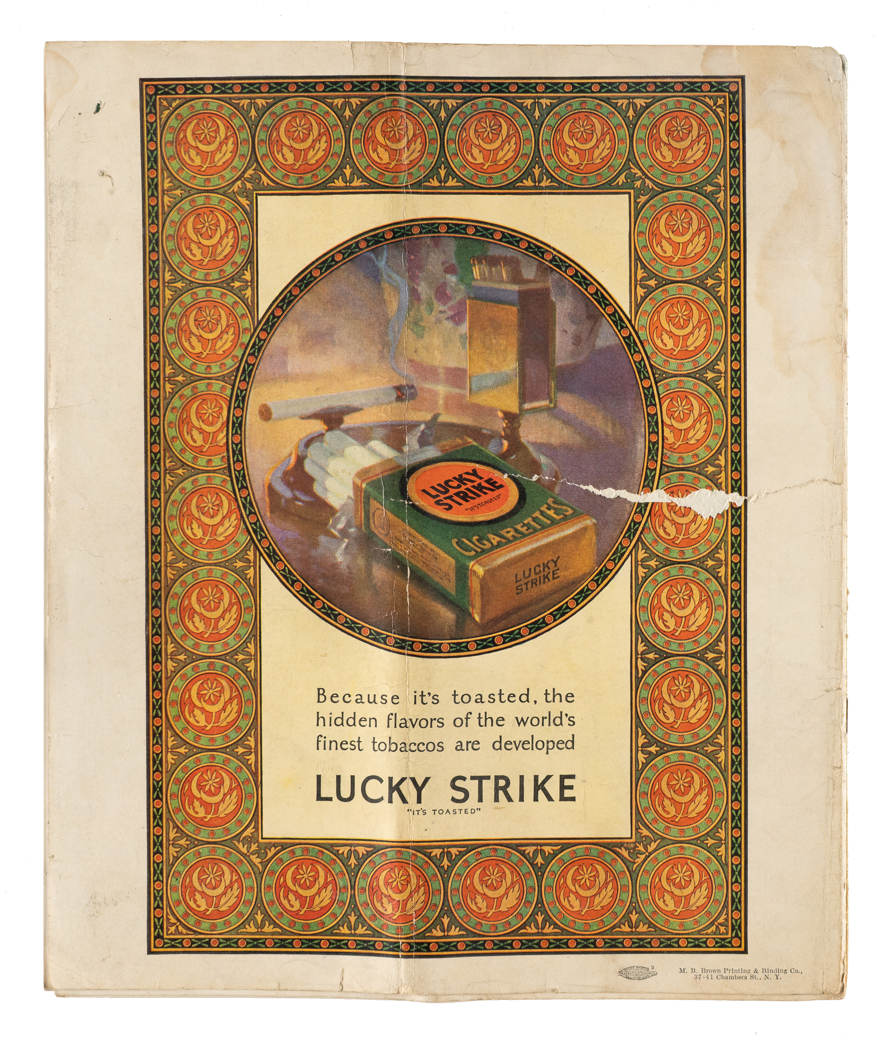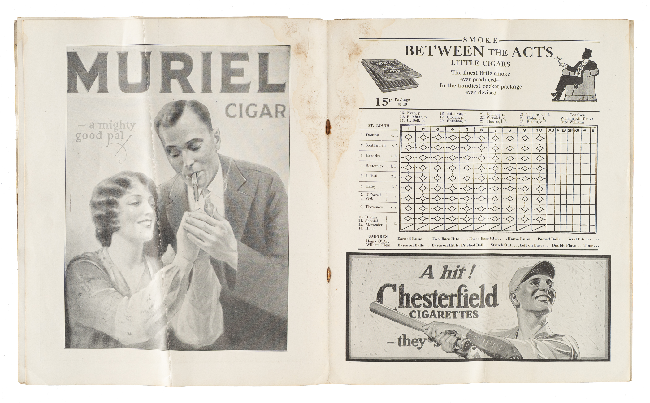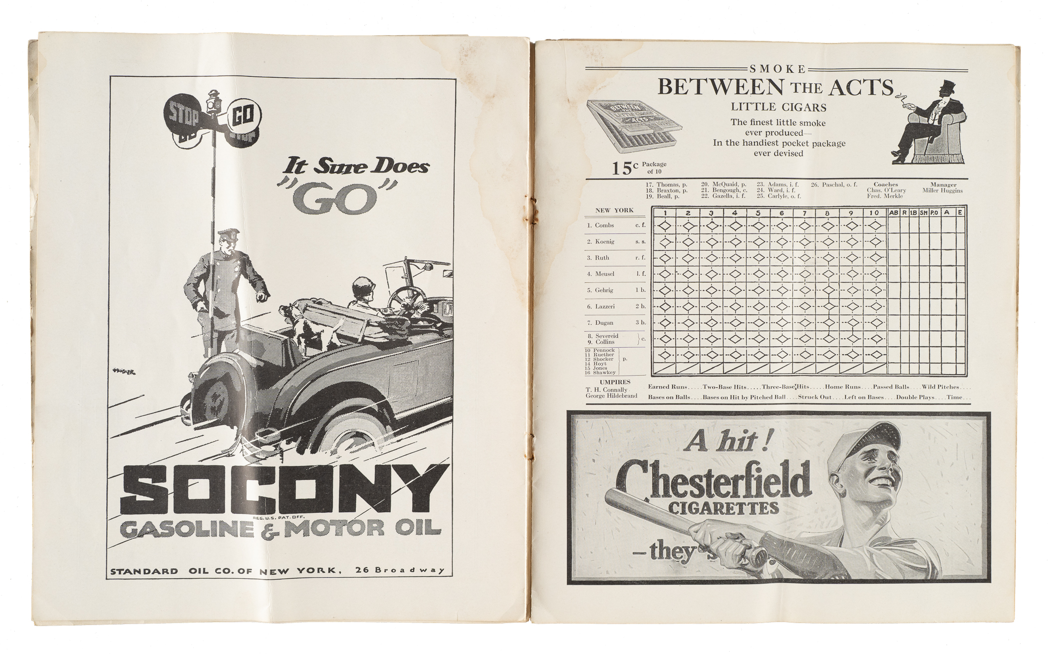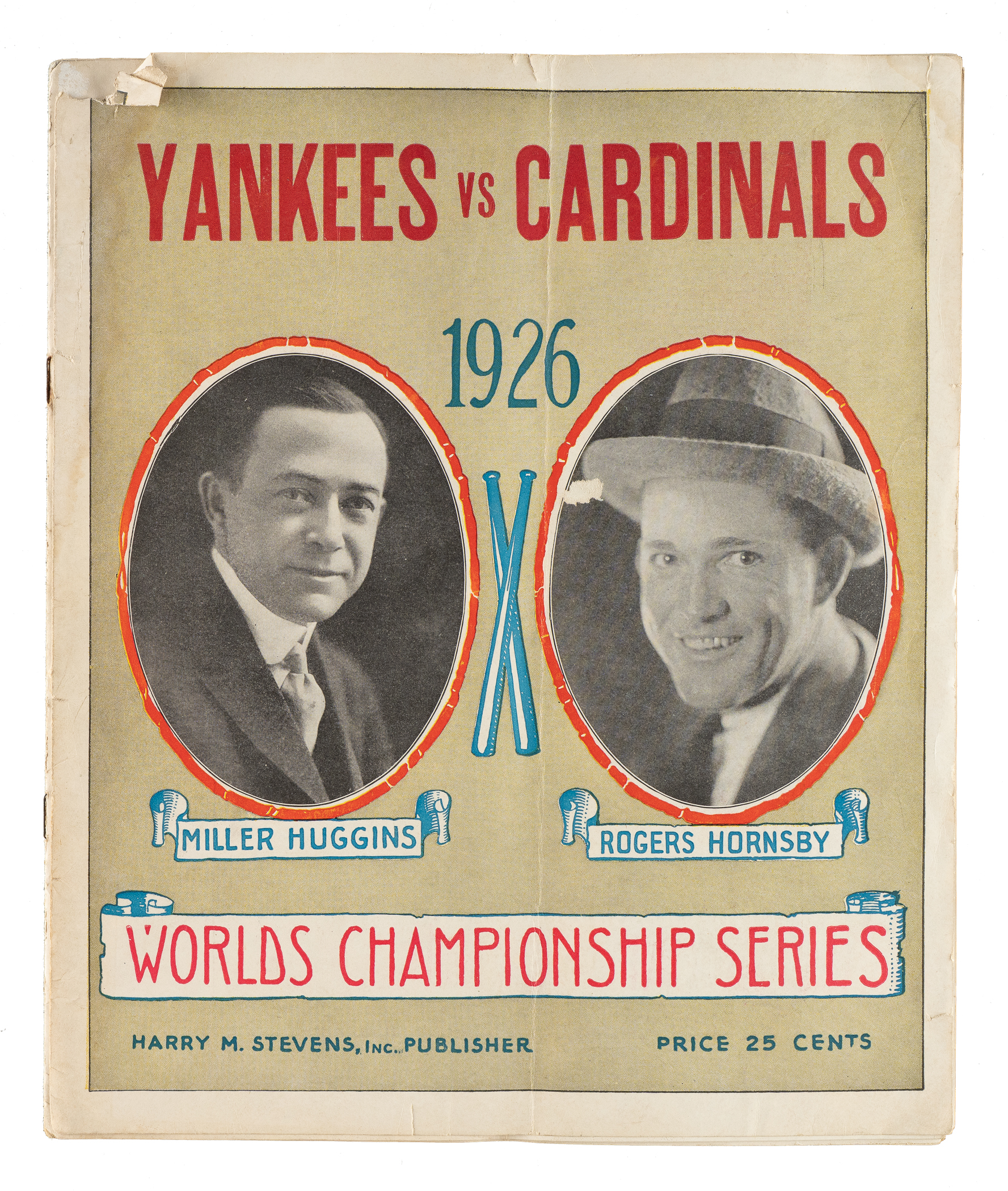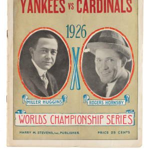 Substantial 16-page, large-format program issued for a 1926 World Series game between the New York Yankees and St. Louis Cardinals at Yankee Stadium. The interior pages include photos of league and team officials, as well as portraits of 25 members of both the Yankees and Cardinals. The preprinted lineups include Ruth, Gehrig, Lazzeri, Combs, and Meusel for New York, and Hornsby, Bottomley, and Hafey for St. Louis. The Cardinals defeated the Yankees in a dramatic seven-game Series in 1926, featuring one of the most memorable moments in postseason history. With the Cardinals clinging to a 3-2 lead in the bottom of the seventh inning of Game 7, Tony Lazzeri came to bat with the bases loaded and two out. Rogers Hornsby then summoned Grover Alexander, who had notched a complete-game victory the day before, from the bullpen. After Lazzeri brought the crowd to their feet with a line drive that landed just foul in the left-field stands, Alexander managed to strike him out to end the threat. Alexander then blanked the Yankees over the next two innings to give the Cardinals their first World Championship in franchise history. The program (9.25 x 11 inches) is unscored. Both covers, along with the page leading up to the Yankees' score page, are detached but included. Other flaws include moisture damage, edge tears, and a vertical fold down the middle. Poor condition overall. This program, along with several other items offered in this auction, originates directly from Urban Shocker's estate and is accompanied by a signed letter of provenance from his great-grandson.