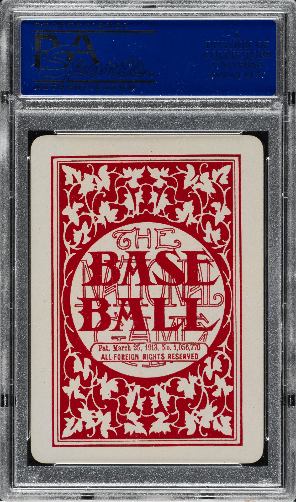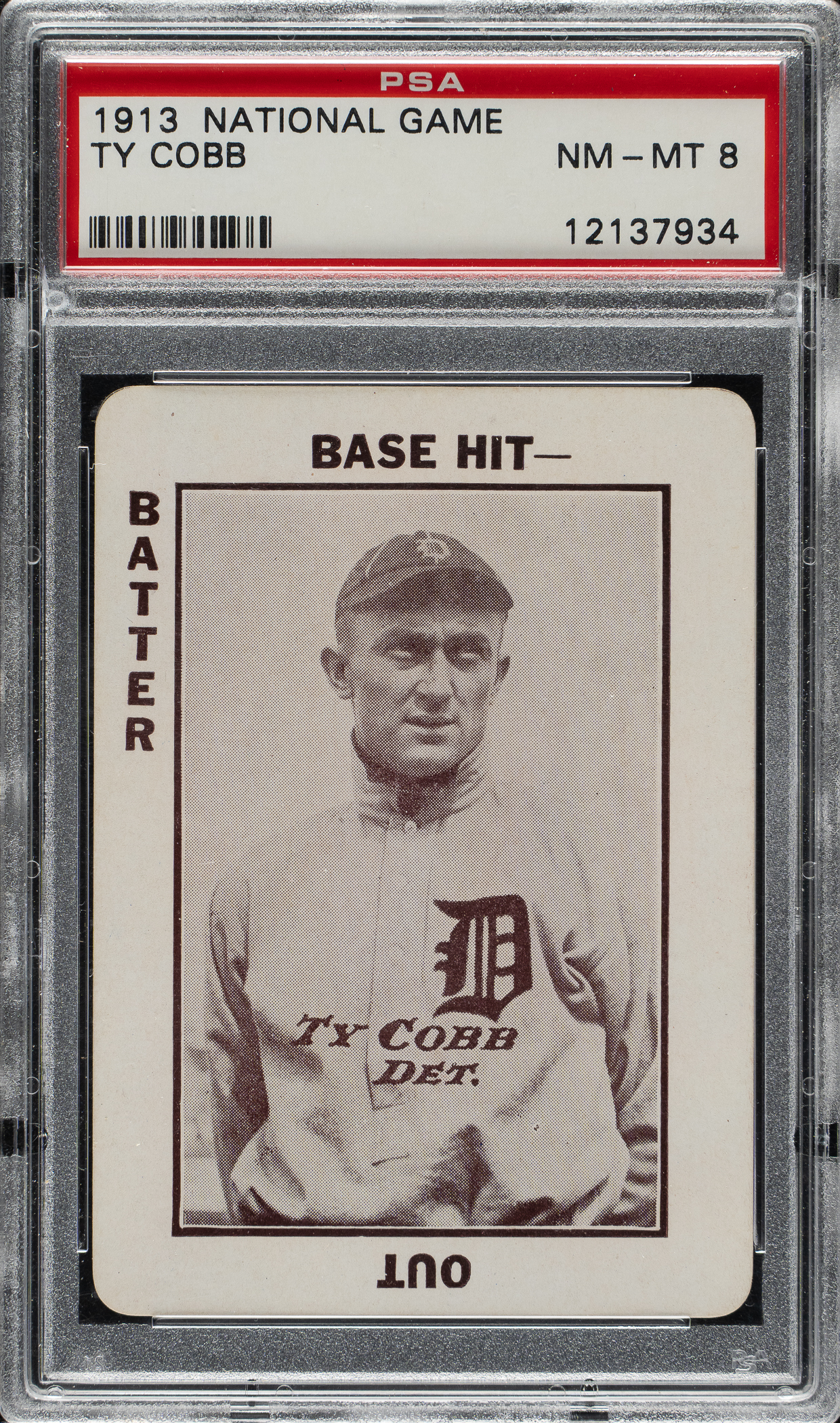 Graded NM-MT 8 by PSA. Very attractive high-grade game card of legendary Detroit Tigers Hall of Famer Ty Cobb from the 1913 WG5 National Game playing-card set. "The National Game" cards are nearly identical in design to the "Tom Barker Baseball" card set except for the different back design, which is in red and features advertising for "The National Game." This card has a crisp image and boldly printed reverse. The corners and edges display virtually no wear. This is a fantastic high-grade example, which would be a worthy addition to a Ty Cobb, Hall of Fame, or vintage-card collection.