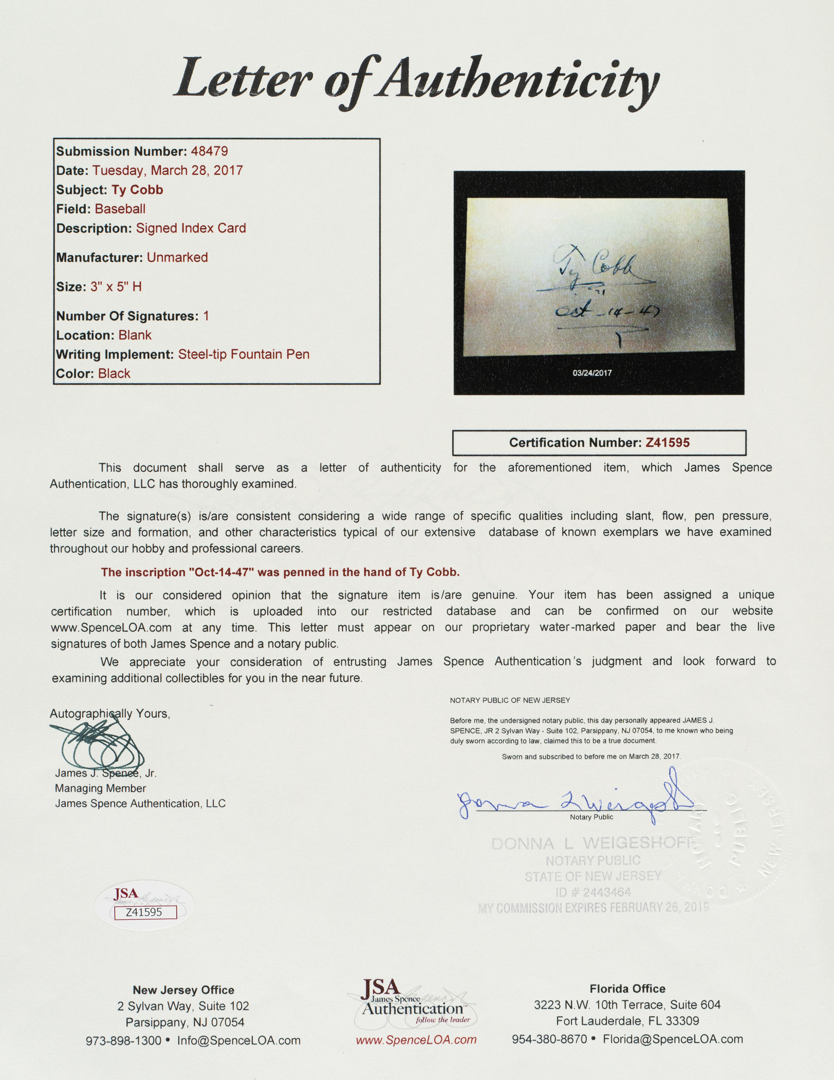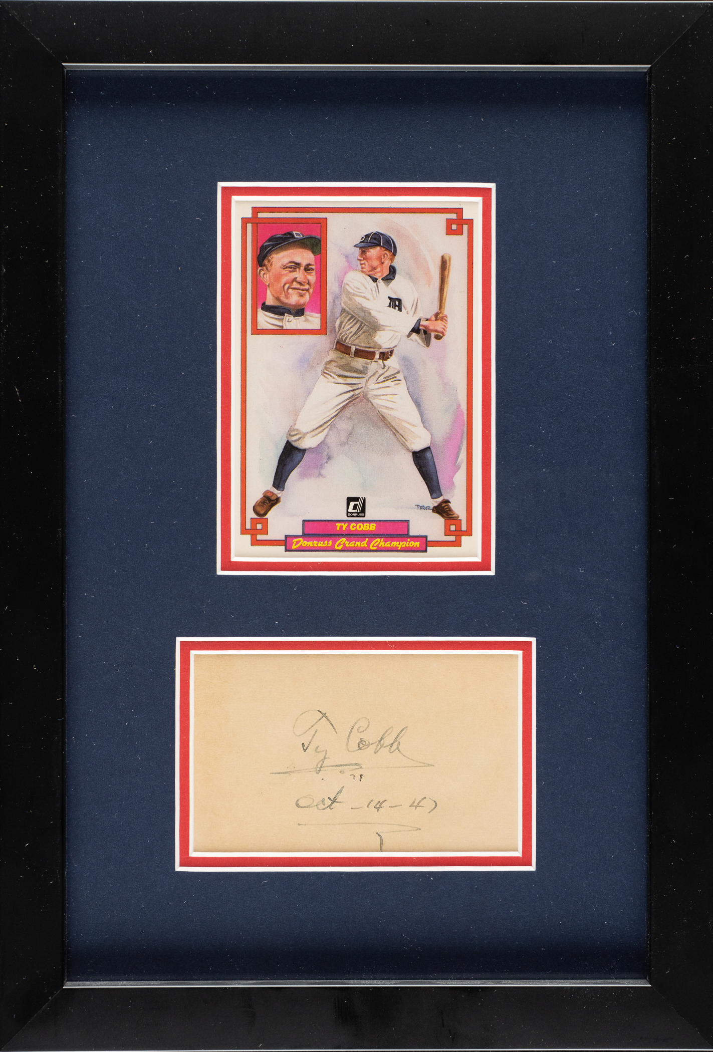 Signed index card of Ty Cobb. Cobb's signature has been executed in black ink, with the date "Oct-14-14" penned below. The index card has been framed together with a 1984 Donruss Champions card of Cobb. The index card (4-1/2 x 2-3/4 inches; visible dimensions) is in apparent Near Mint condition overall. Matted and framed to total dimensions of 9.5 x 14 inches. Full LOA from James Spence/JSA. The size/weight of this item requires that there will be an additional shipping charge for this lot.