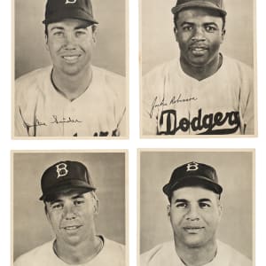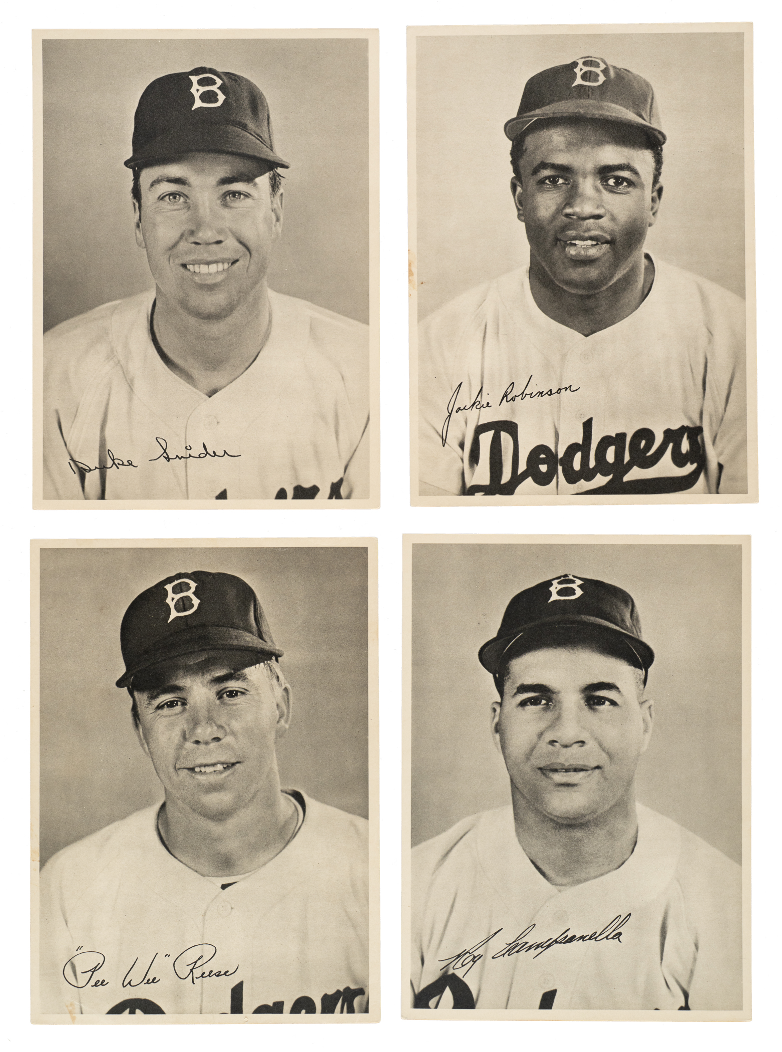 Complete set of twenty-five 1949 Brooklyn Dodgers Picture Pack photos, highlighted by Hall of Famers Jackie Robinson, Roy Campanella, Gil Hodges, Pee Wee Reese, and Duke Snider. Together with the original envelope. Each unnumbered black-and-white photo (6.5 x 9 inches) pictures the player in uniform and features the player's facsimile signature printed next to his image. Condition is Vg overall due to small, scattered wrinkles, with a couple lesser. This set consists of the following: Banta, Barney, Branca, Brown, Campanella (Vg), Cox, Edwards, Furillo, Hatten, Hermanski, Hodges (Vg), Hopp, Jorgensen, McCormick, Miksis, Newcombe, Palica, Pitler, Reese (Gd+), Robinson (minuscule ink mark on reverse, otherwise Vg), Roe, Shotton, Snider (Vg+), Stock, and Sukeforth. The original mailing envelope is very presentable and does no show postal use, technically grading Fair due to creasing, small tears, minor soiling, and damage to the flap. This set would serve as an extraordinary addition to any Brooklyn Dodgers collection. Total: 25 photos plus envelope.
