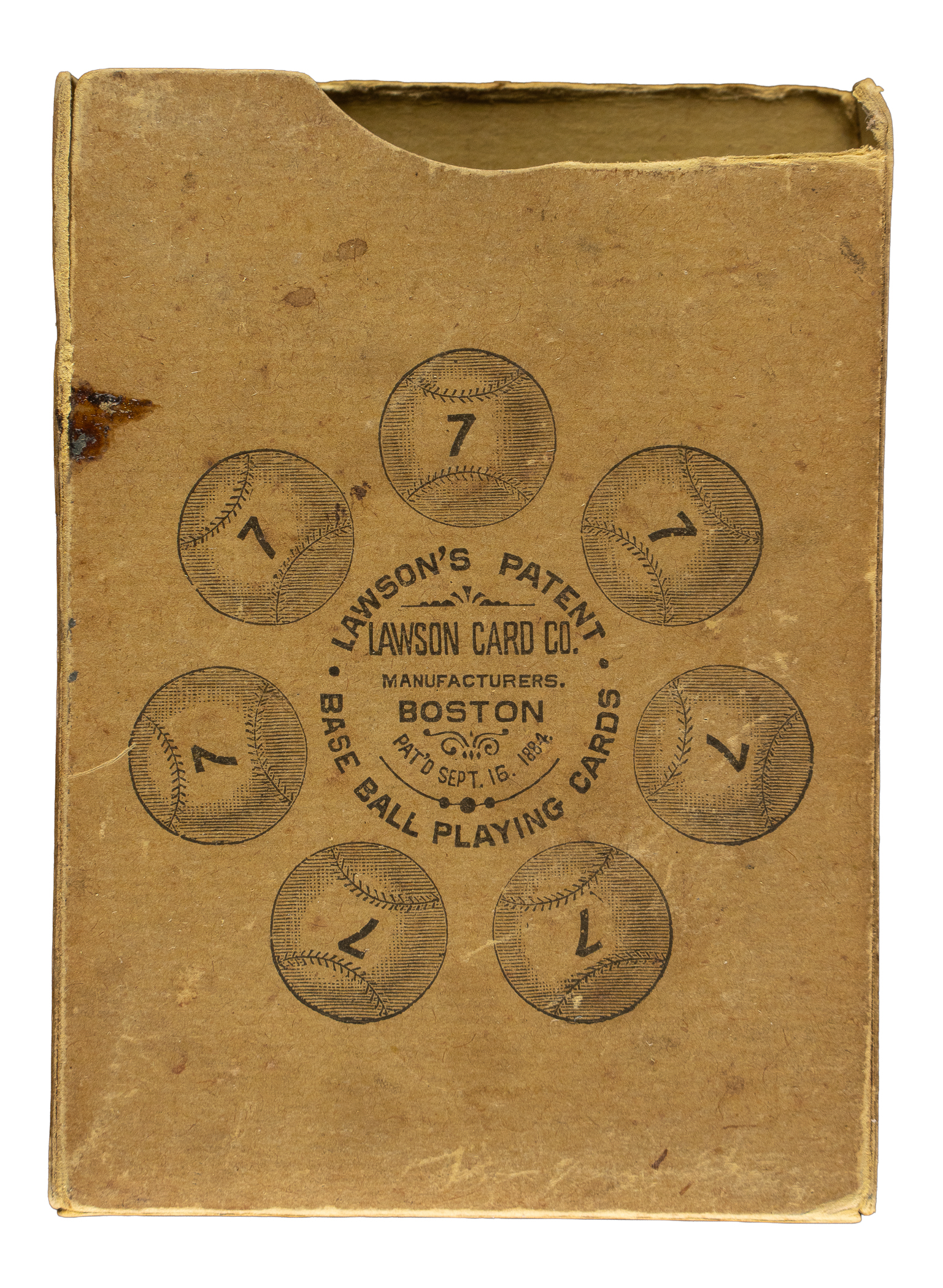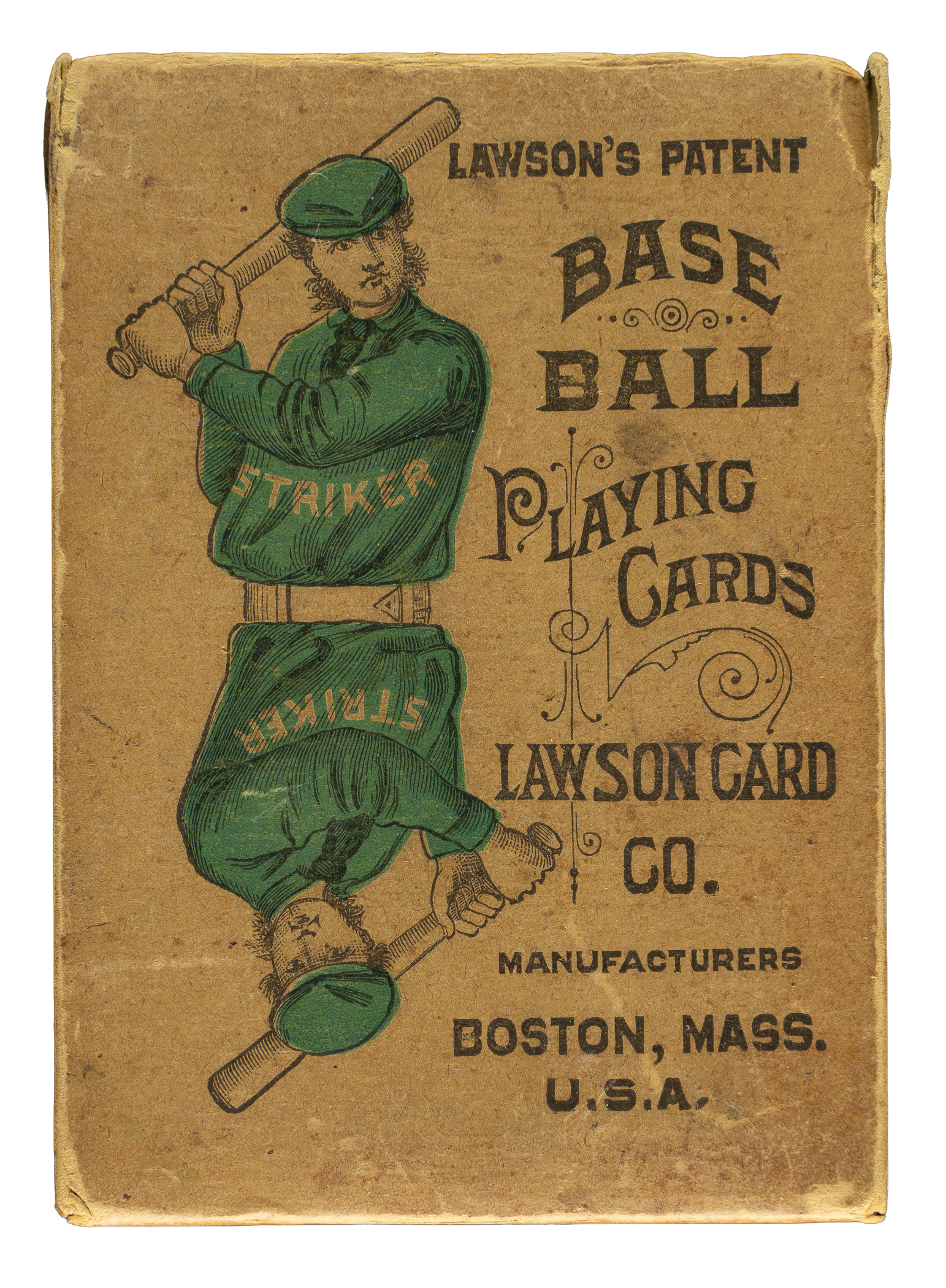 Issued in 1884 by the Lawson Card Company of Boston, Massachusetts, the Lawson's playing-card set features thirty-six cards with extremely striking baseball-related designs. The backs feature a very attractive baseball scene in blue and white (included are four cards featuring the rarer burgundy back). Offered is a complete 36-card standard-edition Lawson's set plus 28 duplicates. Thirty-seven cards (including twelve duplicates) have been graded and encapsulated by PSA. PSA Grading Composite: MINT 9 (7 cards): Striker, Wild Throw, Pick Up (Burgundy), Baseman 3, Fly Ball, 3 Strikes, and 3 Strikes Missed. NM-MT+ 8.5 (3 cards): Base Hit 2, Fly Muff, and 3 Strikes Out. NM-MT 8 (9 cards): Forced Out, Grounder (Burgundy), Base Hit 3, Home Run, Baseman 1, Baseman 2 (Burgundy), Fly Catch, Foul Ball, and Foul Muff. NM 7 (5 cards): 7 Balls, Base Hit 1, Catcher, Umpire, and Foul Catch. EX-MT 6 (1 card): Rules Card. EX 5 (2 cards): Fly Catch and Fly Ball. VG-EX 4 (4 cards): Base Hit 2 (Burgundy), Base Hit 3, Home Run (MK), and 3 Strikes Missed. VG 3 (3 cards): Forced Out, Baseman 1, and Foul Ball. GOOD 2 (3 cards): Base Hit 2, Foul Catch, and Rules Card. The condition of the 29-card unencapsulated balance is four Nr/Mt, Ex, five Vg to Vg-Ex, and nineteen lesser (mostly Fr to Gd and mostly due to staining). This collection is accompanied by the original 20-page instruction booklet explaining the rules of the game, which features a black-and-white woodcut of a batter on the cover, and three "value of cards" cards (two PSA graded and Fr), which explain the scoring of the game. The instructions booklet is complete and intact, with creasing and small tears to front and back covers. The original box grades due to splits at the edges, moderate creasing, light soiling, and missing top flaps. Total: 69 items (set of 36 cards, rules booklet, original box, three "value of cards" cards, and 28 duplicates). The size/weight of this item requires that there will be an additional shipping charge for this lot.