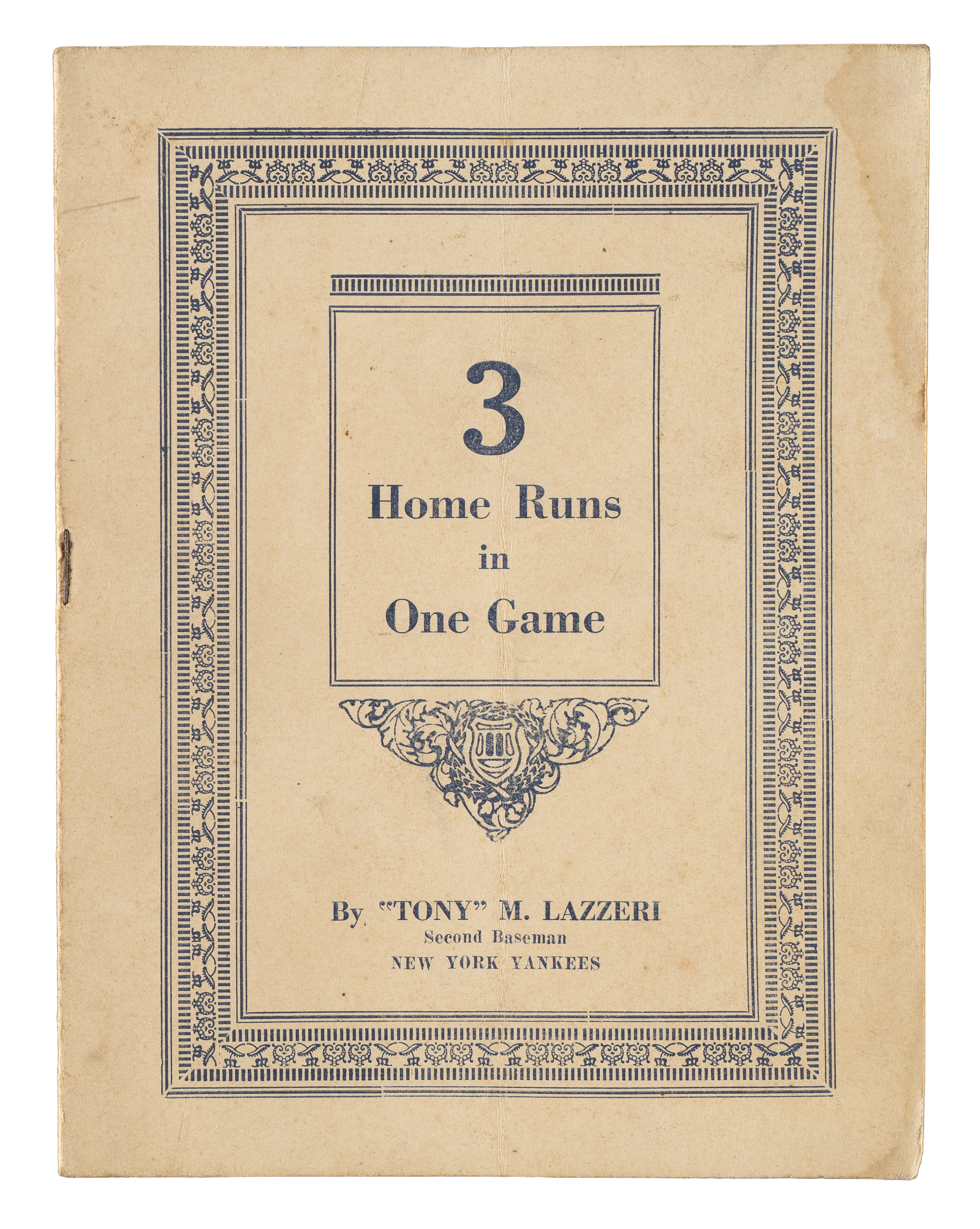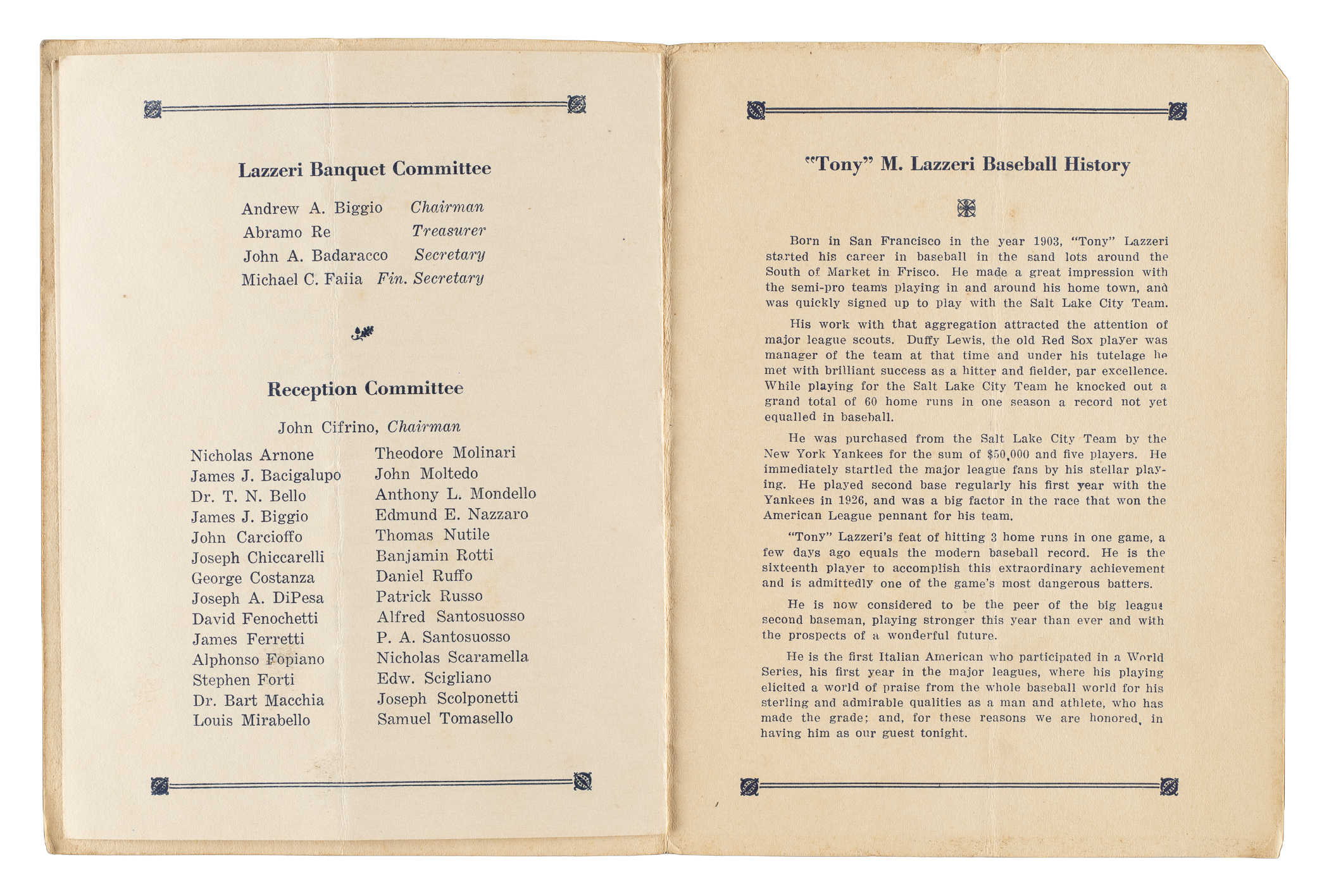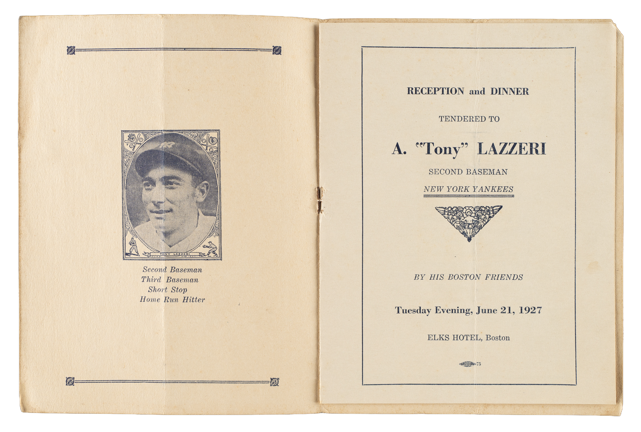 Program issued for a reception and dinner honoring New Yankees Hall of Fame second baseman Tony Lazzeri on June 21, 1927, at the Elks Hotel in Boston. Among the many speakers and guests noted in the interior pages are fellow Hall of Famers Babe Ruth and Miller Huggins. The program (5-5/8 x 7-3/8 inches) features a vertical fold that goes all the way through. There is a light stain on the front cover and stray pencil marks on the back cover. Fair condition overall. This program, along with several other items offered in this auction, originates directly from Urban Shocker's estate and is accompanied by a signed letter of provenance from his great-grandson.