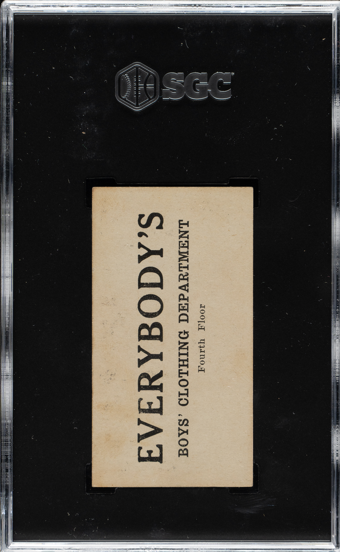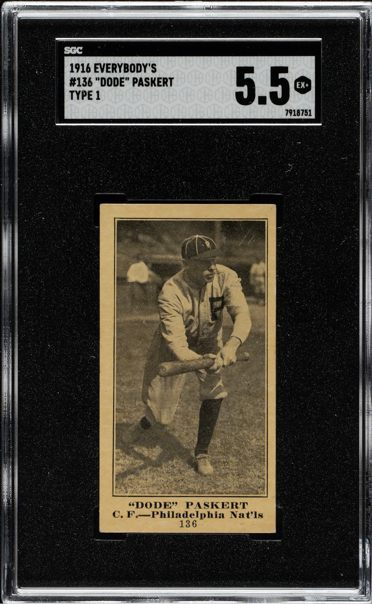 Graded EX+ 5.5 by SGC. One of only two examples graded at this level by SGC with just two higher. Presented is a very attractive example of #136 Dode Paskert from the 1916 M101-4 set featuring an Everybody's Clothing Store advertising reverse. The Everybody's reverse is among the scarcest of the various advertisers found on M101-4 cards. The offered example displays a crisp image and strong corners with light touches of wear. The important advertising reverse is boldly printed and clean. This is an outstanding example of this rare advertising reverse, which would be an ideal addition to any M101-4 or type-card collection.