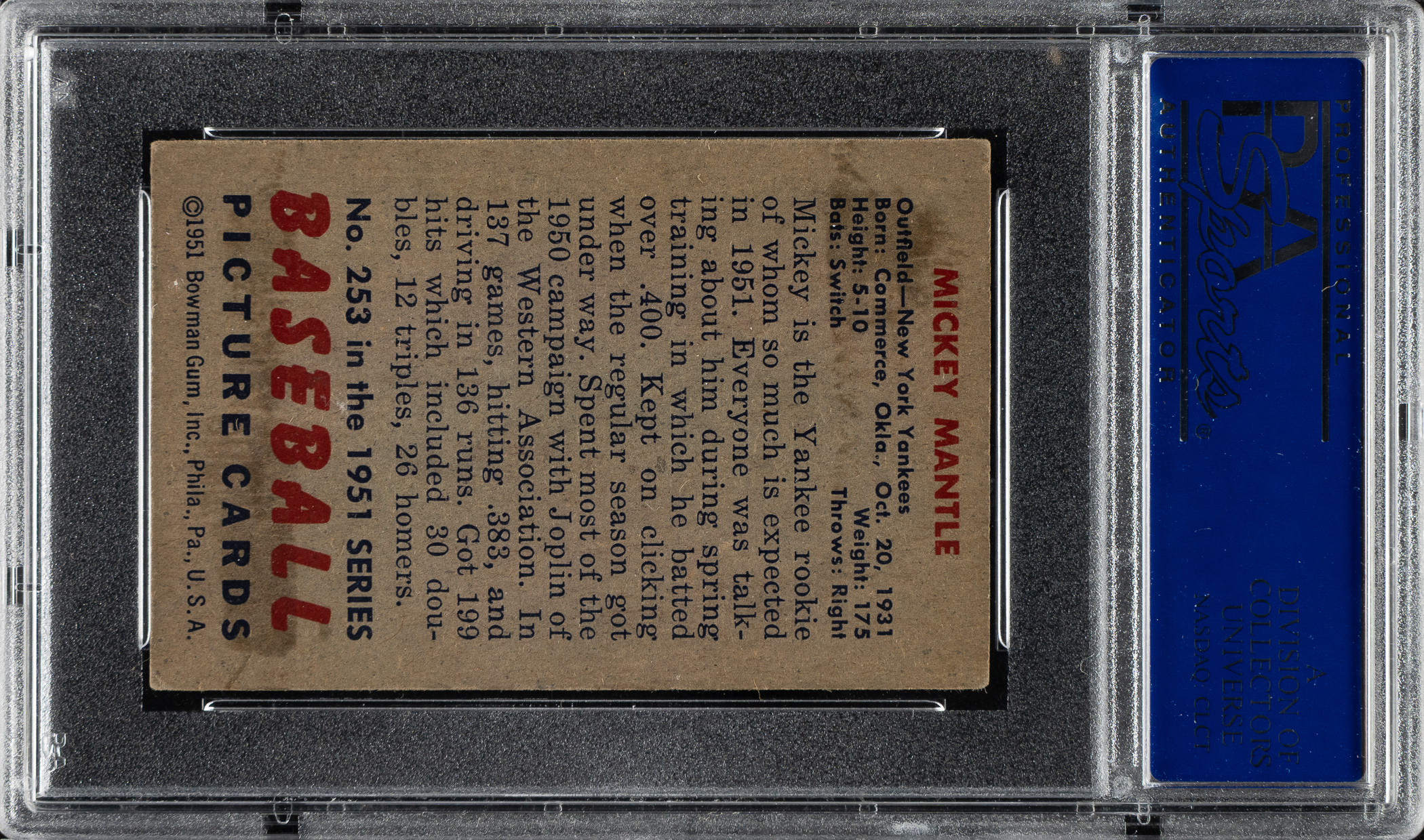 Graded EX 5 by PSA. Tremendous mid-grade example of Mickey Mantle's true rookie card. One of card collecting's great classics, Mantle's Bowman rookie card is the key to the 1951 set and one of the most popular and significant of all postwar baseball cards. This striking example has vibrant colors, outstanding registration, honest corner wear, and excellent centering. Extremely clean with no distracting print lines that are commonly found with this card. Boldly printed reverse displaying a couple light gum stains. A desirable mid-grade example of this legendary card.