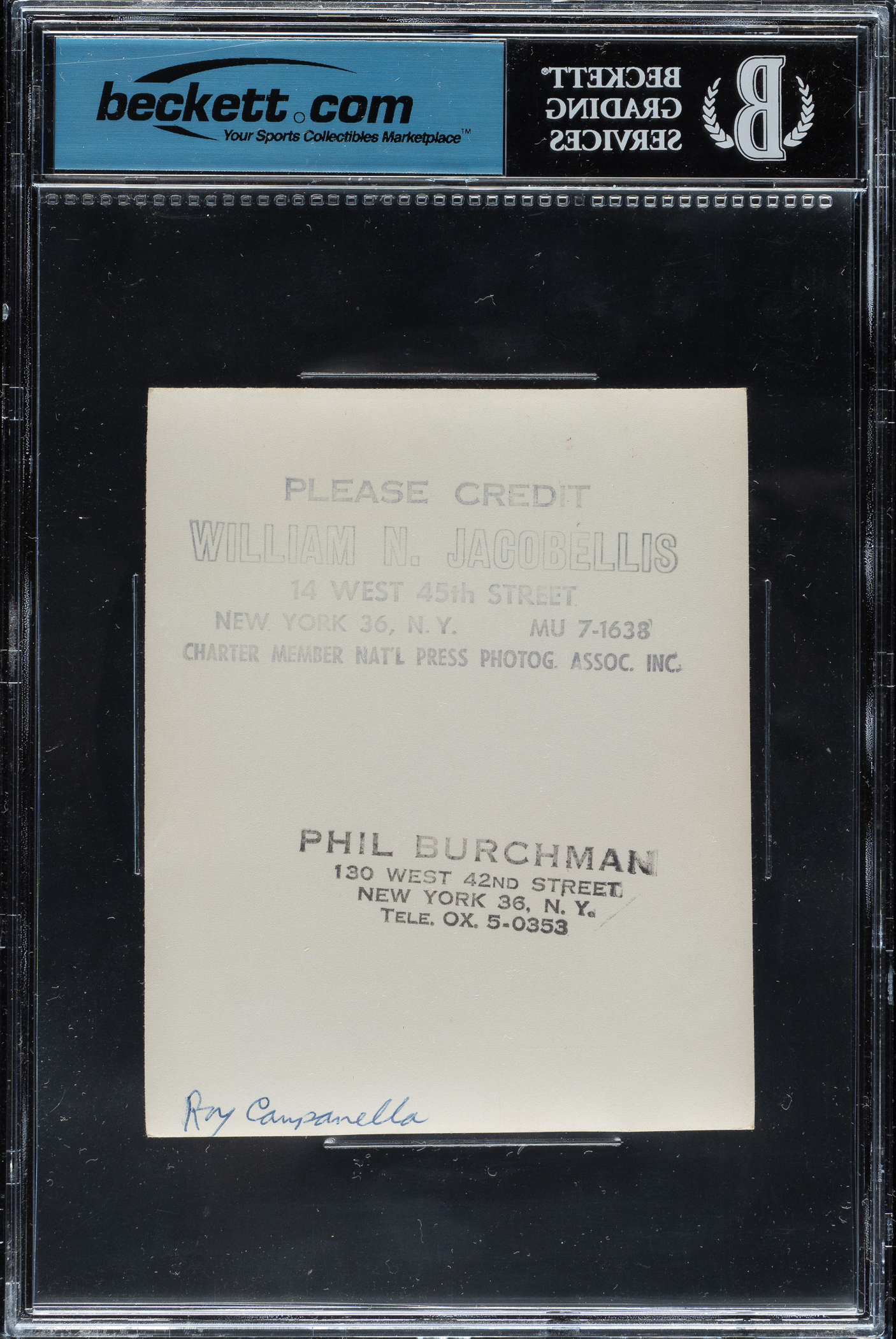 Original contract-proof photo of Hall of Fame catcher Roy Campanella used in the production of Campanella's 1952 Bowman baseball card, by William Jacobellis. Encapsulated and certified as an original Type I photograph by Beckett. The photo captures Campanella as member of the Brooklyn Dodgers in a swing-through pose. Contact proofs such as this have always been highly prized by collectors because of their exceptional clarity and contrast. Jacobellis produced these specialized photos because both Topps and Bowman used many of his images in the production of their baseball cards during the 1950s. This is one of only a small number of vintage photos we have seen featuring a player image attributed to the 1952 Bowman set. The offered photo features Jacobellis’ credit stamp on the reverse, as well as a Campanella's handwritten name and a stamp from Phil Burchman. The photo (4 x 5 inches) is in Very Good to Excellent condition overall.