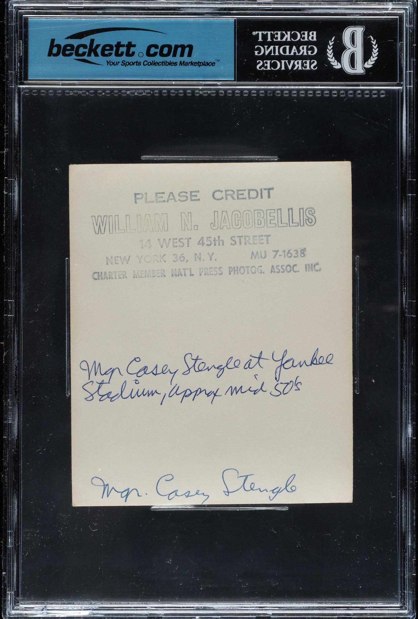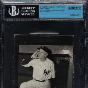 Original contract-proof photo of Hall of Fame manager Casey Stengel used in the production of Stengel's 1952 Bowman baseball card, by William Jacobellis. Encapsulated and certified as an original Type I photograph by Beckett. The photo captures Stengel as a member of the New York Yankees. Contact proofs such as this have always been highly prized by collectors because of their exceptional clarity and contrast. Jacobellis produced these specialized photos because both Topps and Bowman used many of his images in the production of their baseball cards during the 1950s. This is one of only a small number of vintage photos we have seen featuring a player image attributed to the 1952 Bowman set. The offered photo features Jacobellis’ credit stamp on the reverse, as well as multiple editorial notations. The photo (4 x 5 inches) is in Very Good to Excellent condition overall.