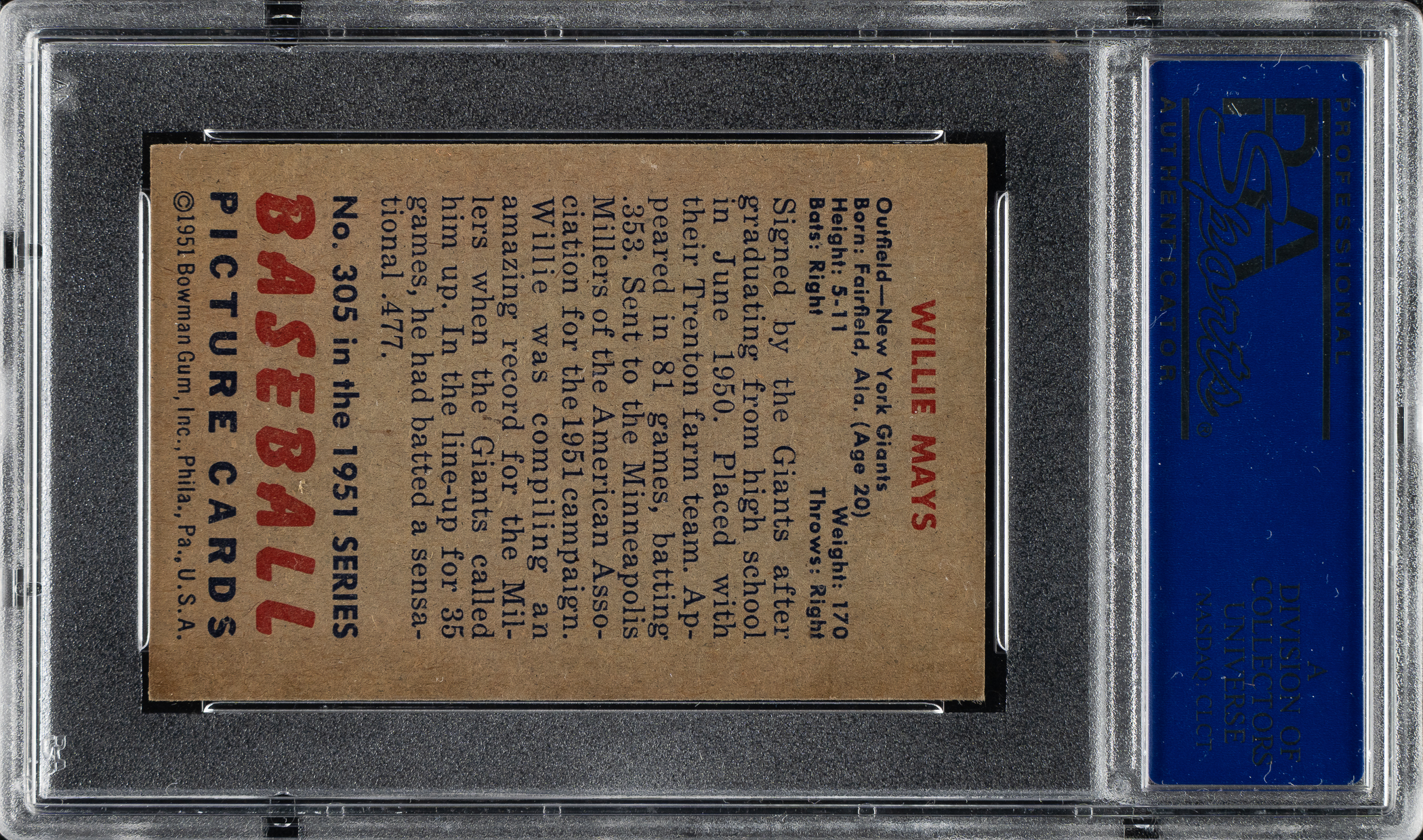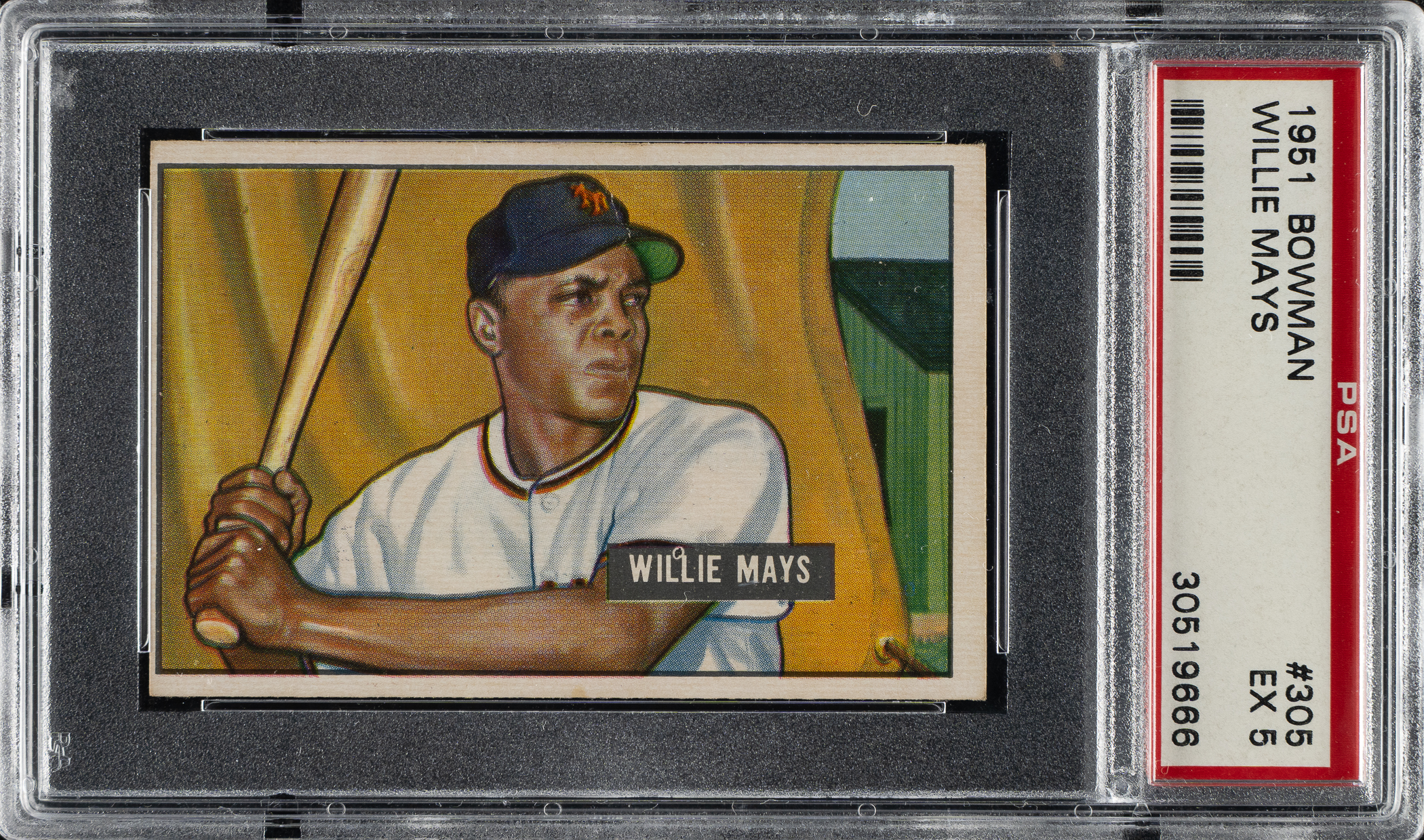 Graded EX 5 by PSA. Extremely desirable rookie card of legendary New York Giants Hall of Famer Willie Mays, one of the most important of all 1950s bubble-gum cards. In addition to being one of the two key cards of the 1951 Bowman set, Mays is part of the scarce high-number series (#253-324). This attractive example displays bright colors, a crisp image, light corner wear, and centering toward the left. Boldly printed reverse. The 1951 Bowman Willie Mays rookie has always been a card-collecting icon, especially among postwar cards. This is a solid example of this classic in an extremely desirable grade, offering an outstanding value compared to higher-graded examples.