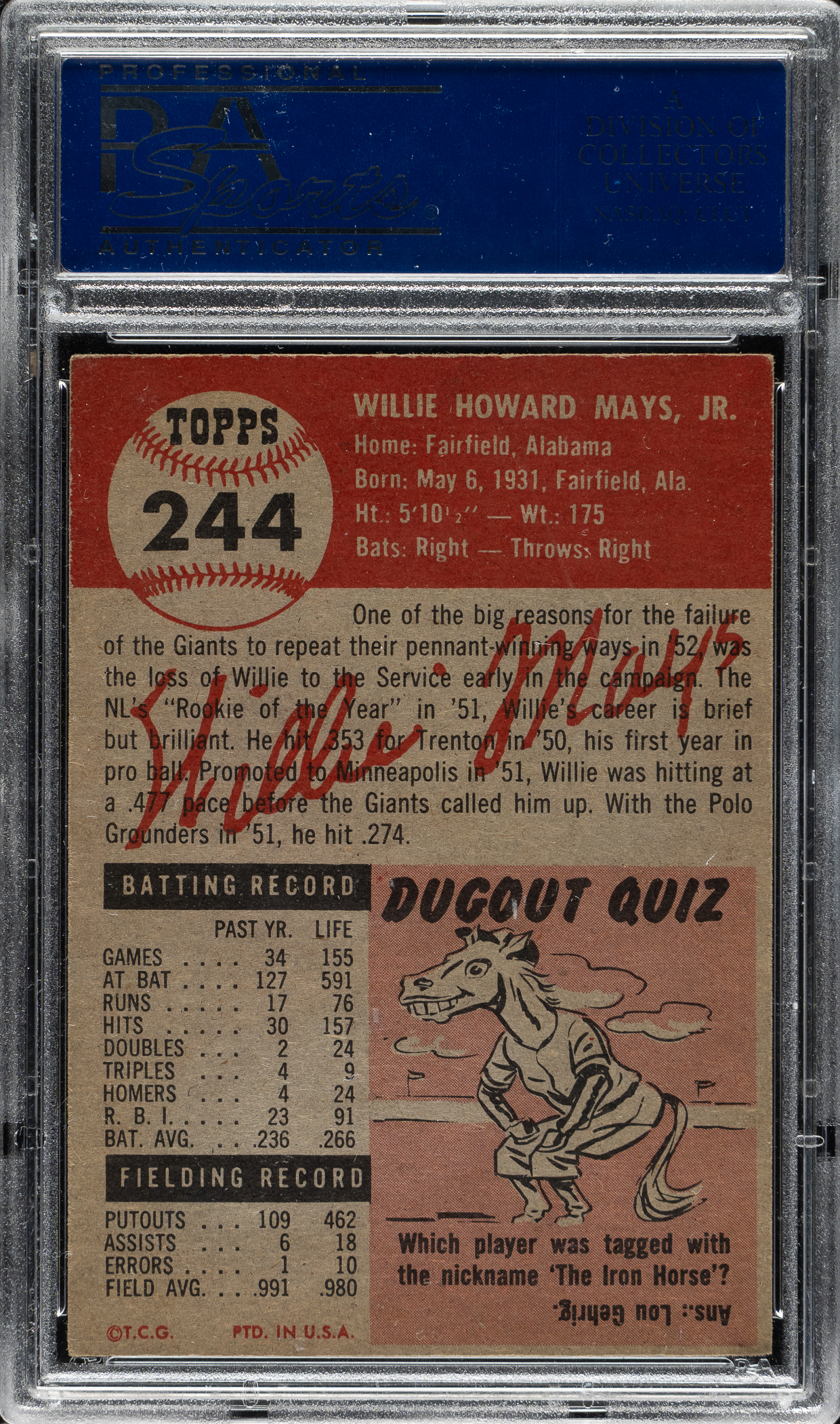 Graded EX 5 by PSA. 1953 Topps card #244 Willie Mays is one of the key cards of the 1950s, one of the most prized of all early Mays cards, and a key card in the 1953 Topps set. This example has bright colors, excellent registration, and light corner wear. Boldly printed reverse. This is a solid mid-grade example.