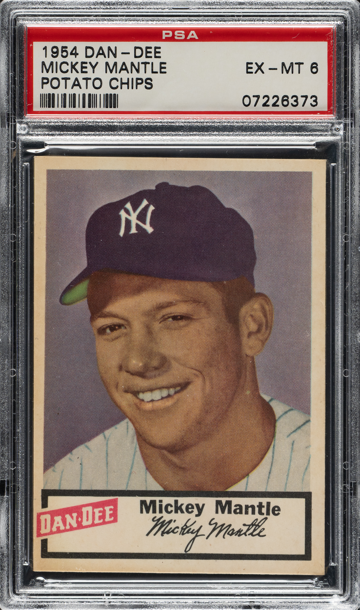 Graded EX-MT 6 by PSA. High-grade example of 1954 Dan-Dee Mickey Mantle. This is one of the rarest and most attractive of all Mantle cards and the key card to the set. Dan-Dee cards were issued one card per package with potato chips. They are usually found with serious condition problems related to this method of issue, including creases and grease stains. The card boasts vibrant colors, a crisp image, strong corners, and no staining. Boldly printed reverse. This is a beautiful example of one of the keys of all 1950s food issues and one of the most highly prized of all Mantle cards.