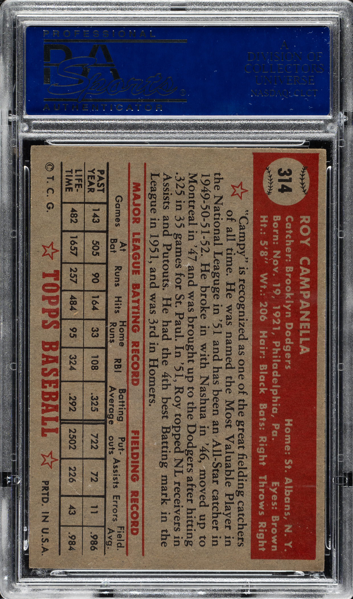 Graded EX 5 by PSA. Very desirable card of Brooklyn Dodgers Hall of Famer #314 Roy Campanella from the extremely popular 1952 Topps issue. This example has vibrant colors, a crisp image, and light corner wear. Clean reverse. This is a solid mid-grade example of Campanella's most classic card, one of the key cards in the entire 1952 Topps set, and one of the few Hall of Famers among the rare high-number card series.