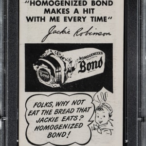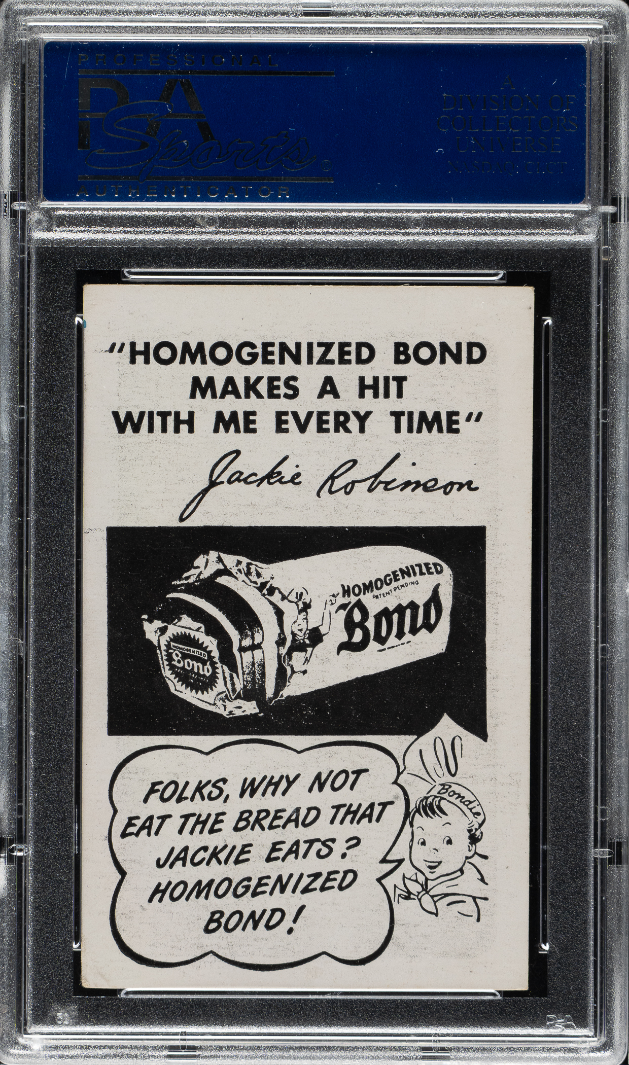 Graded EX 5 by PSA. Beautiful mid-grade example of Jackie Robinson (awaiting pitch pose) from the circa 1947 Bond Bread set. The 13-card set is devoted entirely to Jackie Robinson and features the Brooklyn Dodgers Hall of Famer in various black-and-white poses on glossy card stock. (Please note we are offering each card from the set individually in this current auction.) This example is bright and crisp with superb image quality and light corner wear (a tiny crease is visible across the lower right). The back — which bears Robinson's facsimile signature and the tagline "Folks, why not eat the bread that Jackie eats?" — is boldly printed. The circa 1947 Bond Bread issue is a historic set, dating from Jackie Robinson's earliest days in the major leagues, and individual cards from this classic issue will always be extremely desirable.