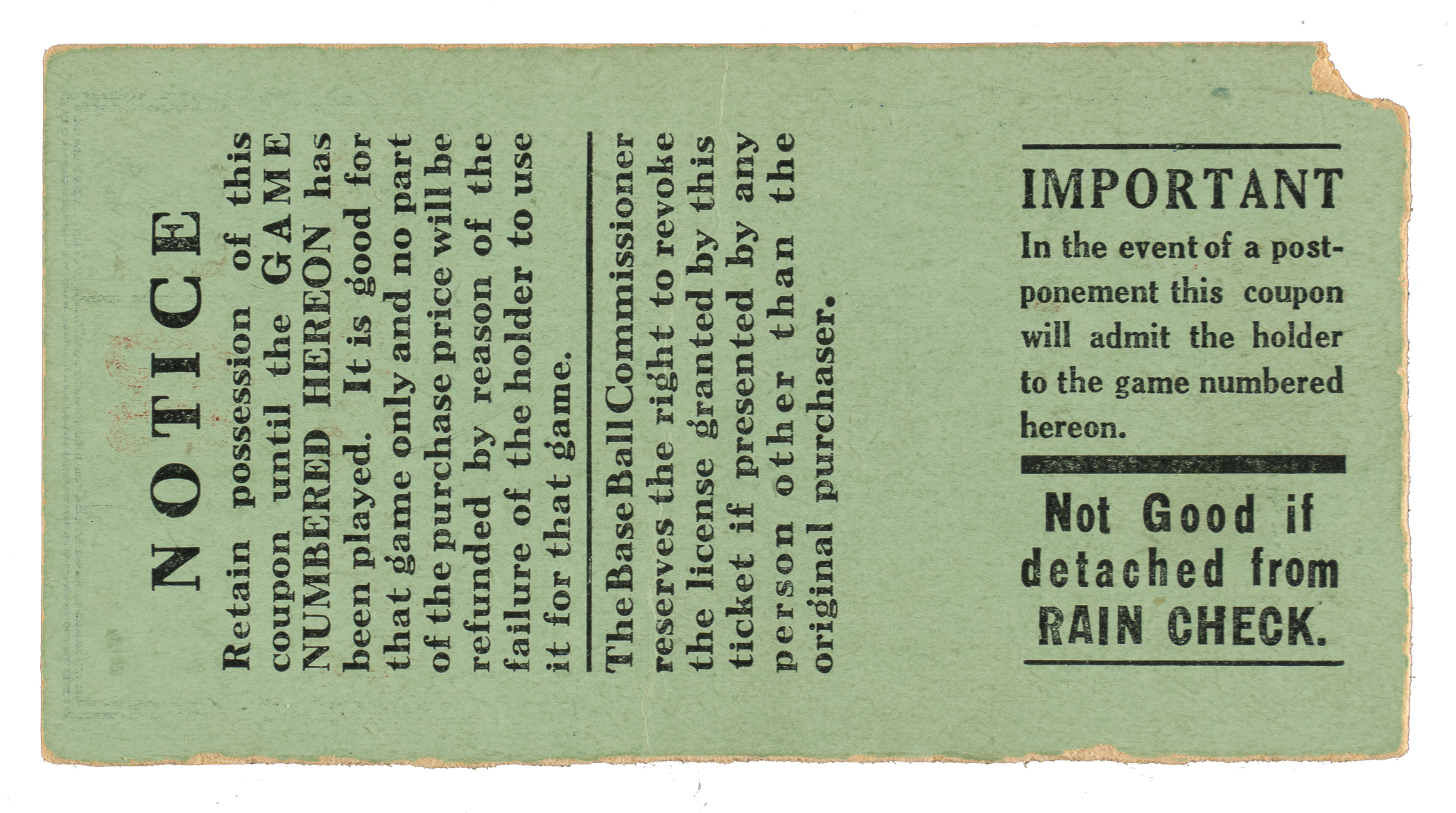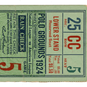 Ticket stub issued for Game 5 of the 1924 World Series between the New York Giants and Washington Senators at the Polo Grounds. New York starting pitcher Jack Bentley not only outdueled the legendary Walter Johnson, but he also hit a home run off him, as the Giants defeated the Senators 6-2. The ticket stub (4.25 x 2.25 inches), which is for a "Lower Stand Res." seat is in Good condition overall.