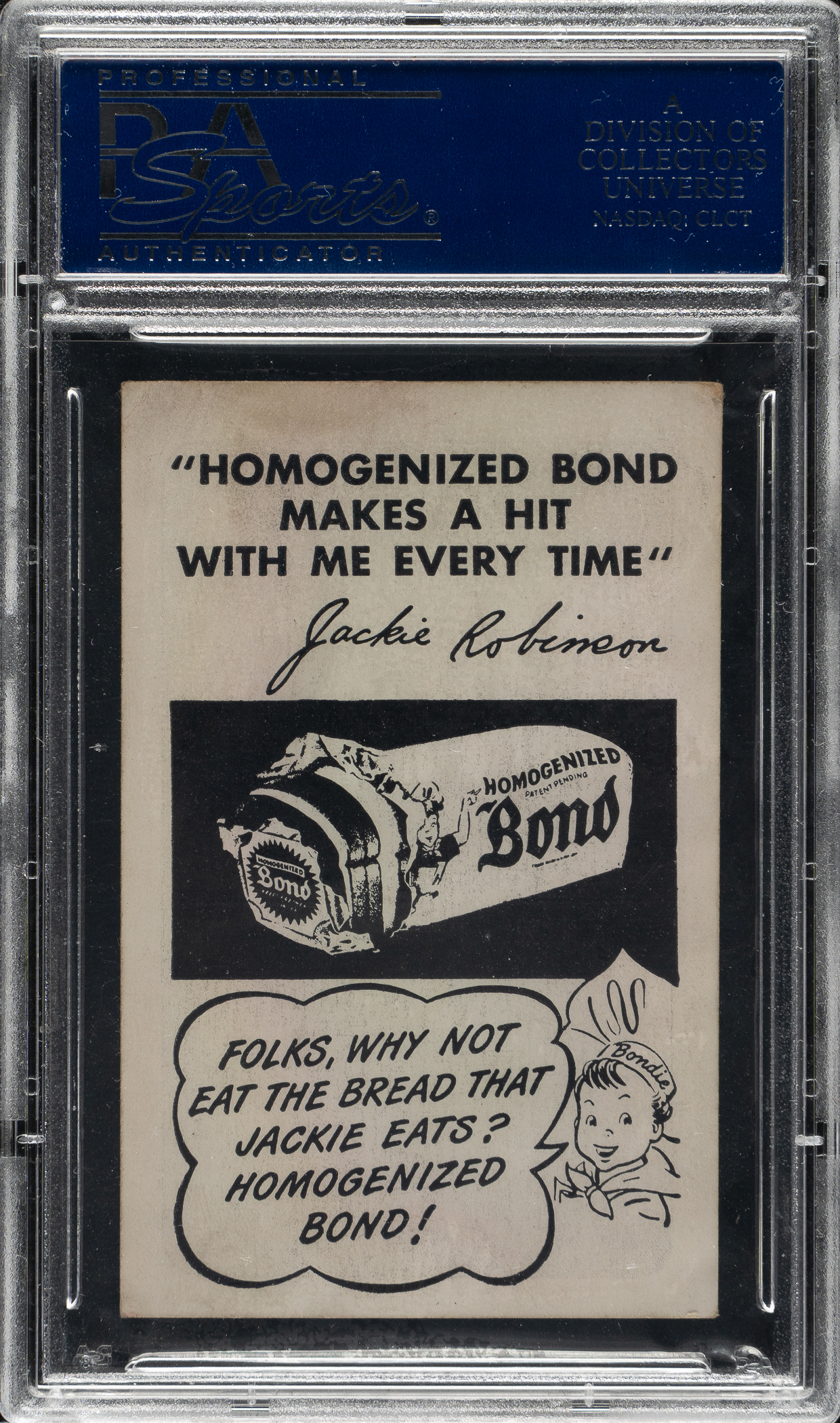 Graded VG 3 by PSA. Strong mid-grade example of Jackie Robinson (portrait, glove in the air pose) from the circa 1947 Bond Bread set. The 13-card set is devoted entirely to Jackie Robinson and features the Brooklyn Dodgers Hall of Famer in various black-and-white poses on glossy card stock. (Please note we are offering each card from the set individually in this current auction.) This example is bright and crisp with superb image quality and even corner wear. Light creasing and surface wear are present on the upper right corner. The back — which bears Robinson's facsimile signature and the tagline "Folks, why not eat the bread that Jackie eats?" — is boldly printed. The circa 1947 Bond Bread issue is a historic set, dating from Jackie Robinson's earliest days in the major leagues, and individual cards from this classic issue will always be extremely desirable.