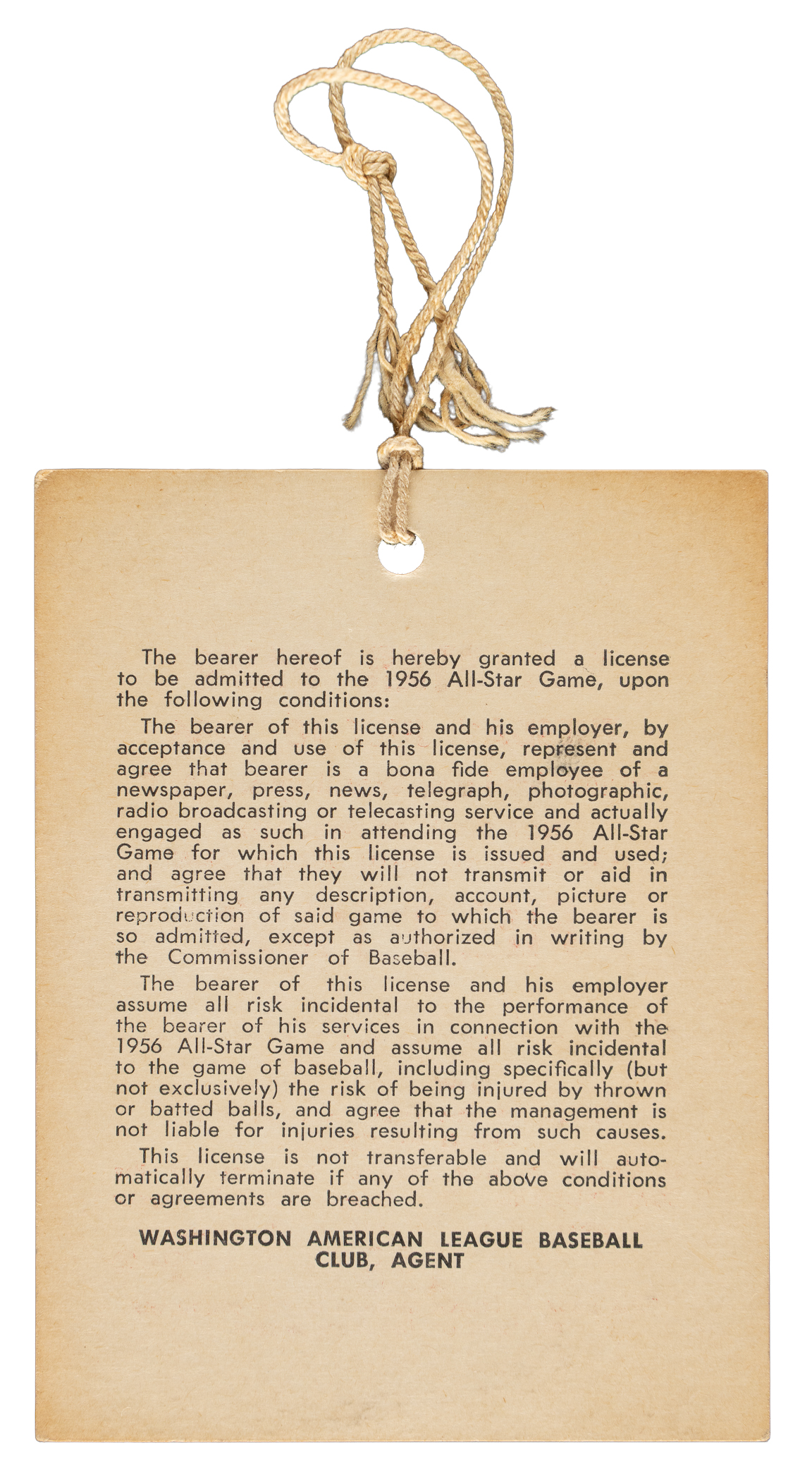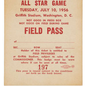 Field pass issued for the 1956 All-Star Game held at Griffith Stadium in Washington, D.C. on July 10th. In front of 29,243 fans, the National League defeated the American League 7-3, in a game highlighted by Hall of Famers Mickey Mantle, Willie Mays, Stan Musial, and Ted Williams each homering. The cardboard pass (3 x 4 inches), which is complete with its original string, is in Excellent condition overall.