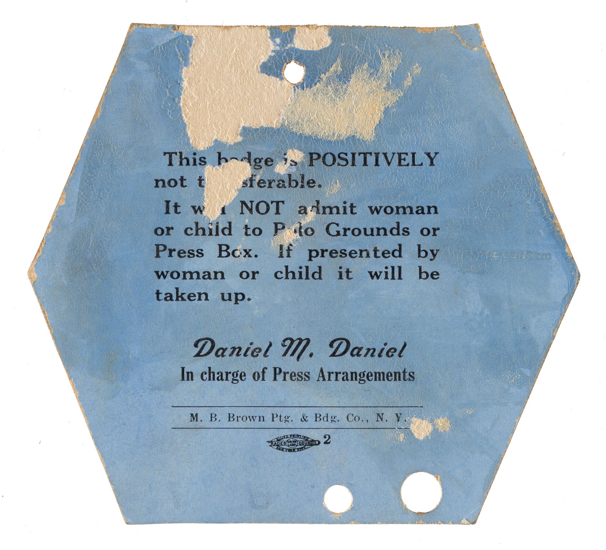 Press pass issued for games 1, 2, 6, and 7 for the 1933 World Series between the Washington Senators and New York Giants at the Polo Grounds. The pass is punched for the first two games. The pass (3-1/8 x 2-7/8 inches), which is missing its original string, is in Poor condition overall.