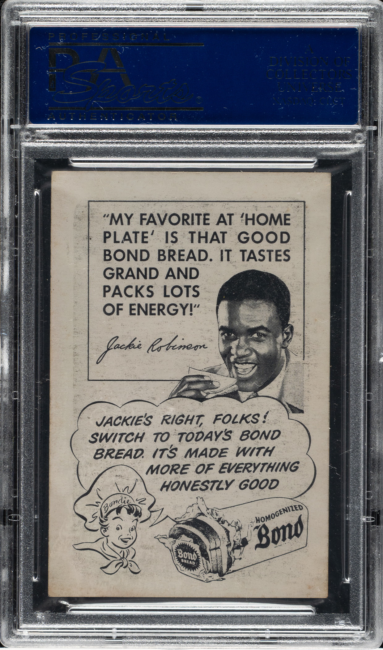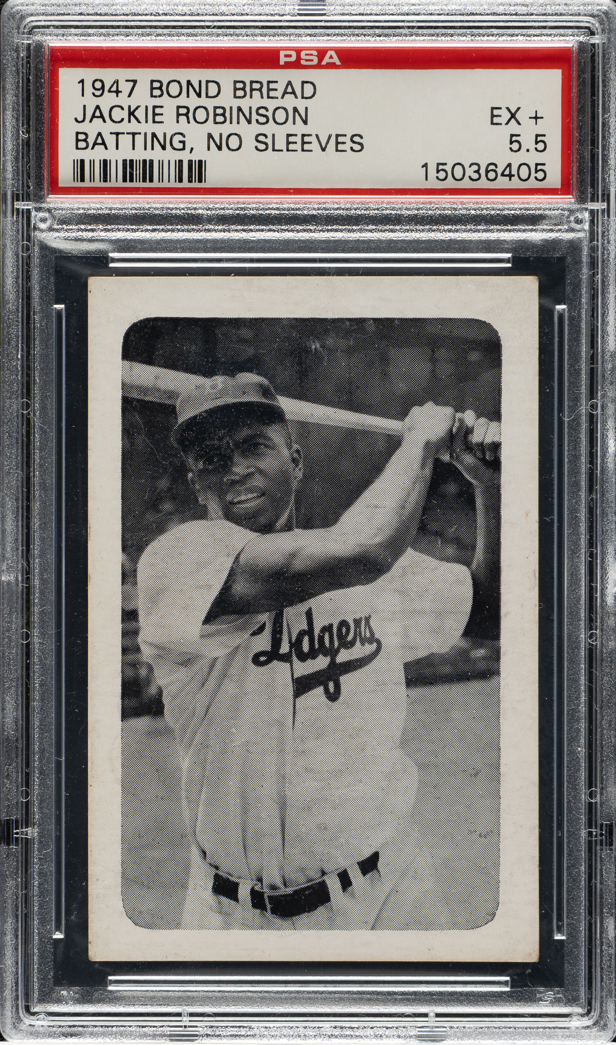 Graded EX+ 5.5 by PSA. Beautiful mid-grade example of Jackie Robinson (batting, no sleeves pose) from the circa 1947 Bond Bread set. The 13-card set is devoted entirely to Jackie Robinson and features the Brooklyn Dodgers Hall of Famer in various black-and-white poses on glossy card stock. (Please note we are offering each card from the set individually in this current auction.) This example is bright and crisp with a bold image and light corner wear. The back, which features an image of Robinson alongside a testimonial for Bond Bread, as well as advertising for the company, is boldly printed. The circa 1947 Bond Bread issue is a historic set, dating from Jackie Robinson's earliest days in the major leagues, and individual cards from this classic issue will always be extremely desirable.