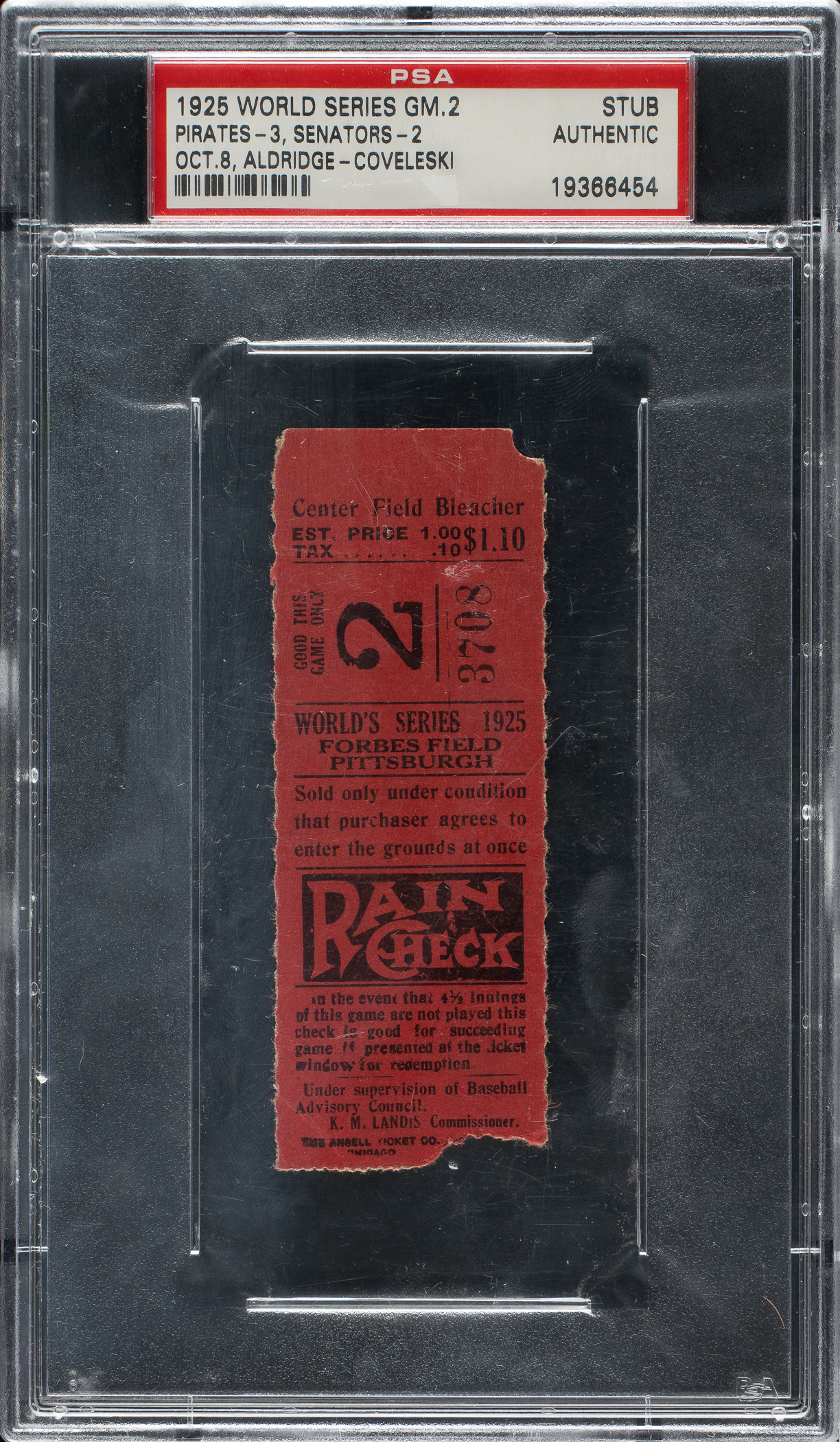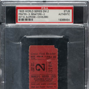 Ticket stub (1-3/8 x 3-5/8 inches) issued for Game 2 of the 1925 World Series at Forbes Field in Pittsburgh on October 8th. The 1925 World Series matched the defending champion Washington Senators against the Pittsburgh Pirates. This was a historic series as it marked the first time in World Series play that a winning team overcame a three-games-to-one deficit. The club that accomplished that feat was the Pirates, who defeated Walter Johnson 9-7 in Game 7. Encapsulated as "Authentic" by PSA, the ticket presents in Fair condition overall.