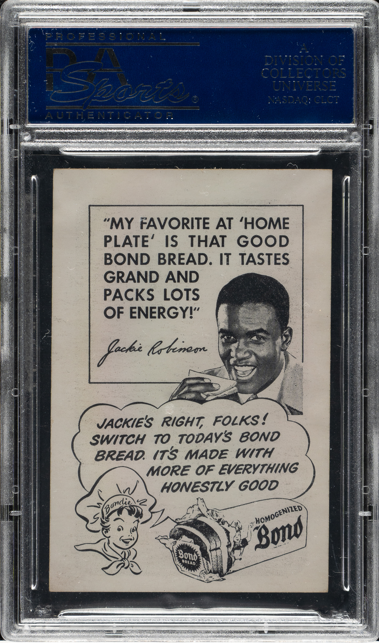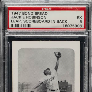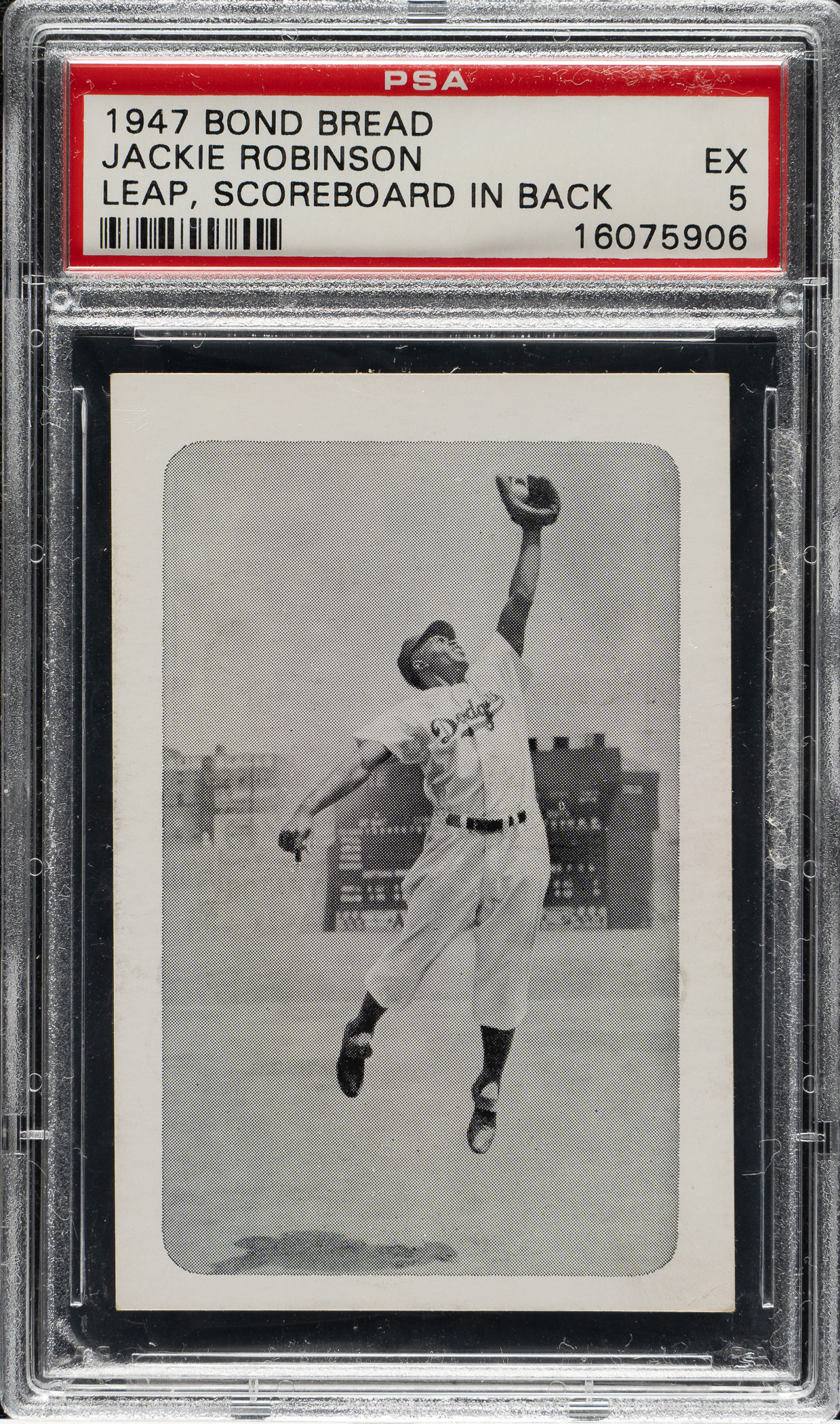 Graded EX 5 by PSA. Beautiful mid-grade example of Jackie Robinson (leaping, scoreboard in background pose) from the circa 1947 Bond Bread set. The 13-card set is devoted entirely to Jackie Robinson and features the Brooklyn Dodgers Hall of Famer in various black-and-white poses on glossy card stock. (Please note we are offering each card from the set individually in this current auction.) This example is bright and crisp with superb image quality and light corner wear. The back, which features an image of Robinson alongside a testimonial for Bond Bread as well as advertising for the company, is boldly printed. The circa 1947 Bond Bread issue is a historic set, dating from Jackie Robinson's earliest days in the major leagues, and individual cards from this classic issue will always be extremely desirable.