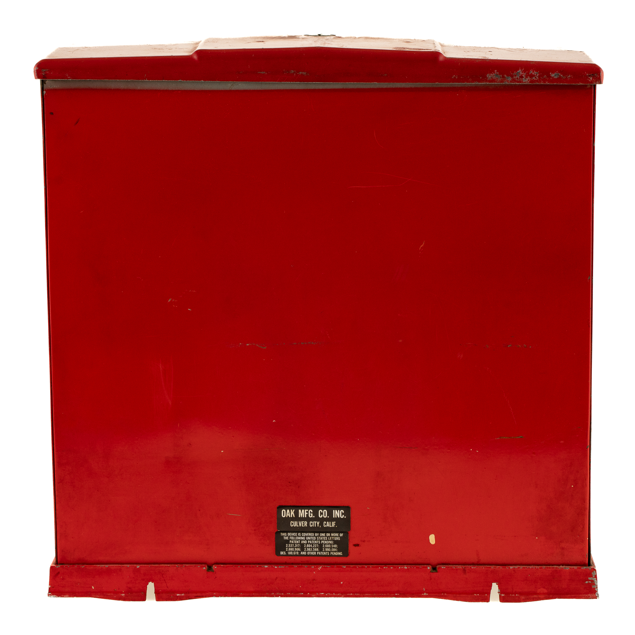 This coin-operated machine (13 x 5.5 x 13 inches) of quality metal construction is designed to dispense a gum ball and baseball card for a penny. Two trading cards (1959 Topps #385 Lollar and 1965 Philadelphia James Bond #18) are displayed on either side of the center compartment that holds the gum balls. A label on the center glass reads "Premier Ball Gum and Card/1¢" (the text "Ball Gum" has been cut out of the label). In the 1950s and 1960s, these machines were very popular at convenience stores and grocery stores. In working order, with accompanying key and ideal for display or use. The machine displays wear commensurate with its age and former use, including a number of light-to-moderate scratches and abrasion. The size/weight of this item requires that there will be an additional shipping charge for this lot.