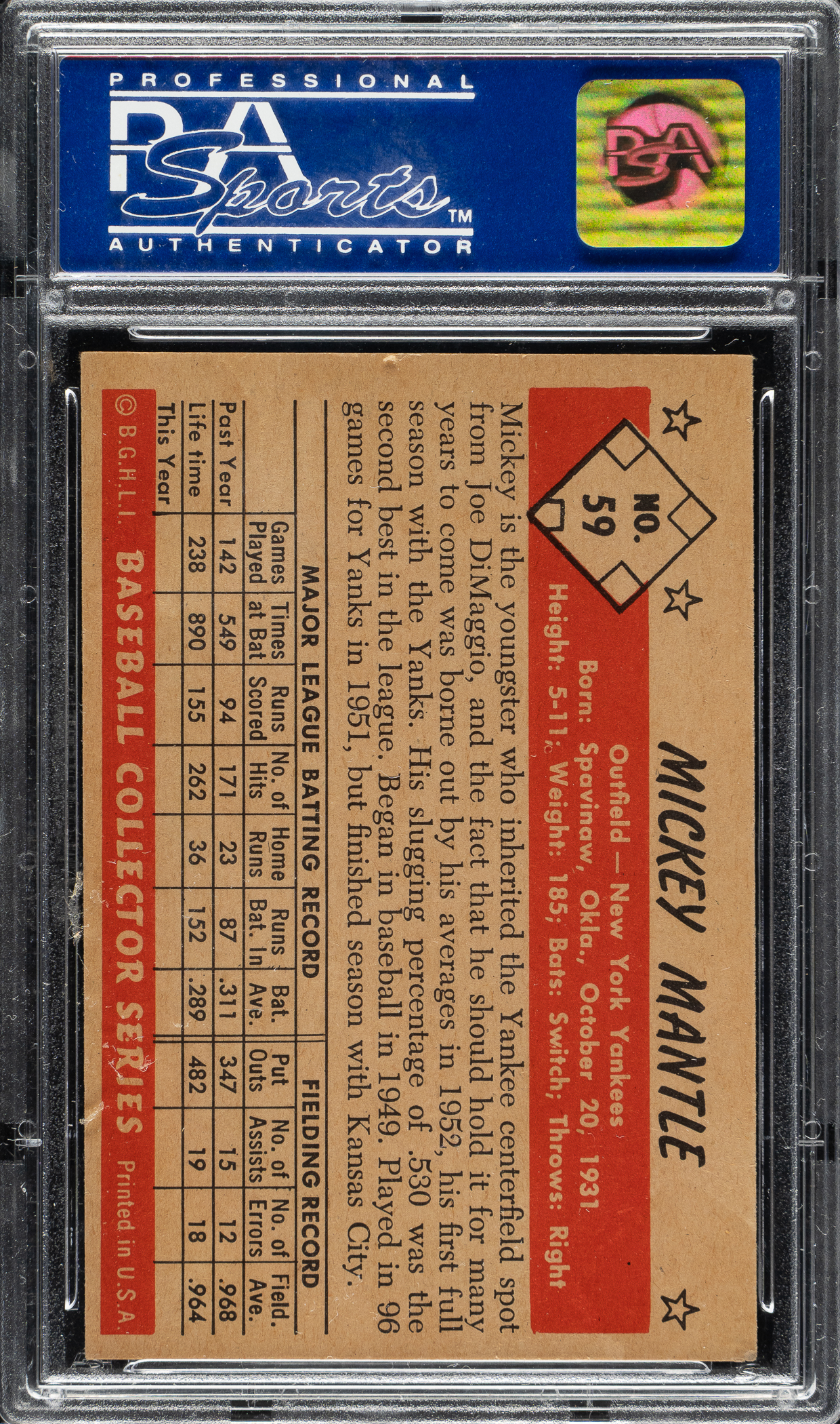 Graded EX 5 by PSA. Attractive mid-grade example of Mickey Mantle from the 1953 Bowman Color series. This example has a crisp image, light corner wear, and centering toward the bottom. Clean reverse. This is a solid mid-grade example of one of collecting's most famous cards.