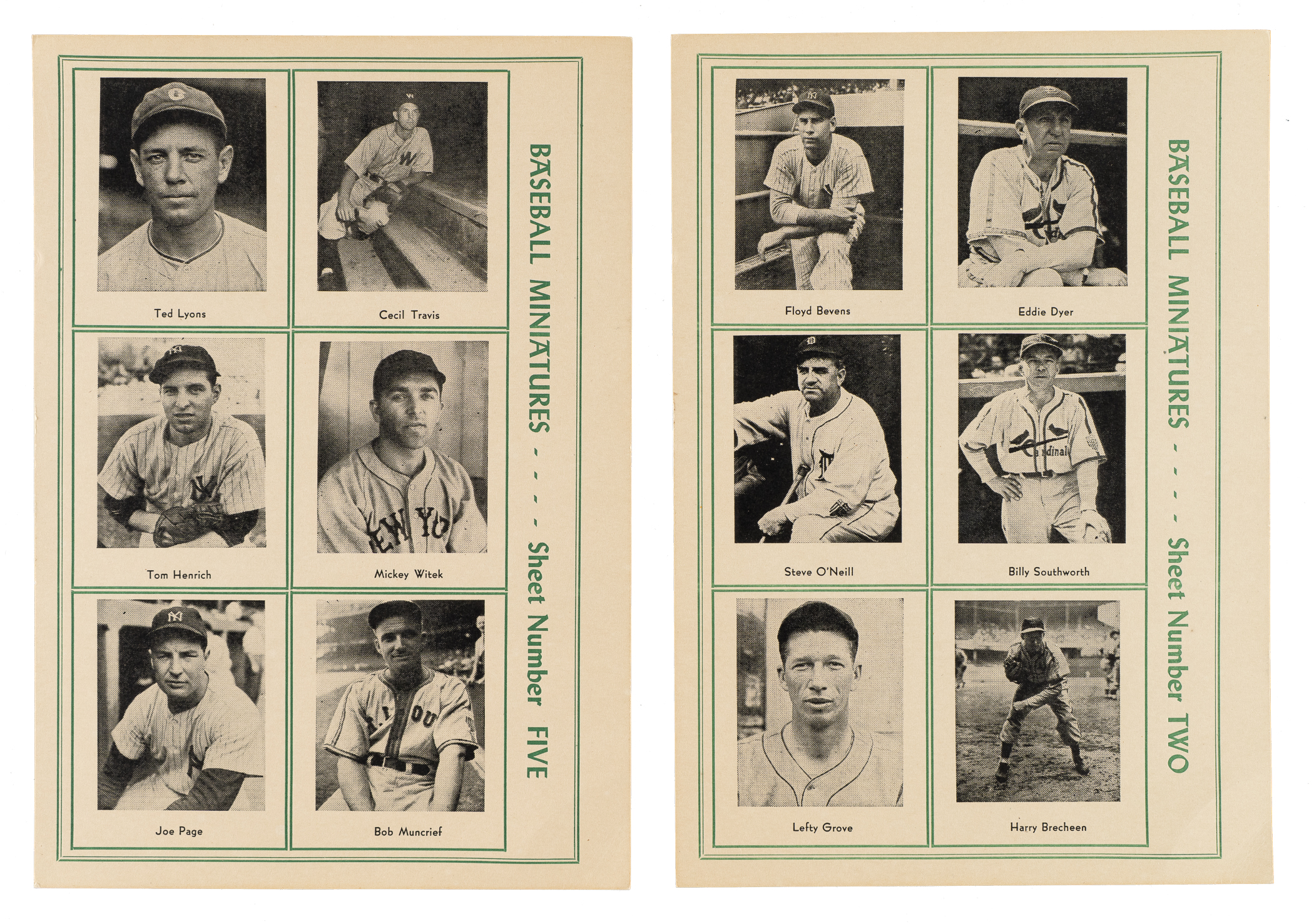 Six uncut sheets of 1947 W602 Sports Exchange Baseball Miniatures cards, each featuring six cards, representing the complete subset of 36 cards from the "green border" series. This series was designed and released in three different series (red, green, or gold borders) by The Trading Post, one of the hobby's first periodicals, for just a $1 a series. Naturally, these are rare to find in complete-sheet form as originally issued. This is a fascinating set that with the many Hall of Famers and stars, current and past, the number of noteworthy cards in this set rivals the number of common cards. Highlighted by Lou Gehrig, Honus Wagner, Joe DiMaggio, Stan Musial, Lefty Grove, Pee Wee Reese, Bill Dickey, and many more. The sheets (each measure 7 x 10 inches) feature black-and-white images of the players with their name below and the text "Baseball Miniatures - - - - Sheet Number" printed vertically along the right border. Interior cards including Gehrig and DiMaggio are Nr/Mt-Mt. All the sheets have a light crease (in the same area most likely from storage) and moderate corner wear; all are still overall in Excellent condition. W602 is a very substantial set. It also represents one of the very few sets issued in the 1940s. W602 cards are beginning to be recognized for the outstanding value they represent compared with most other vintage cards. Total: 6 sheets representing 36 cards.