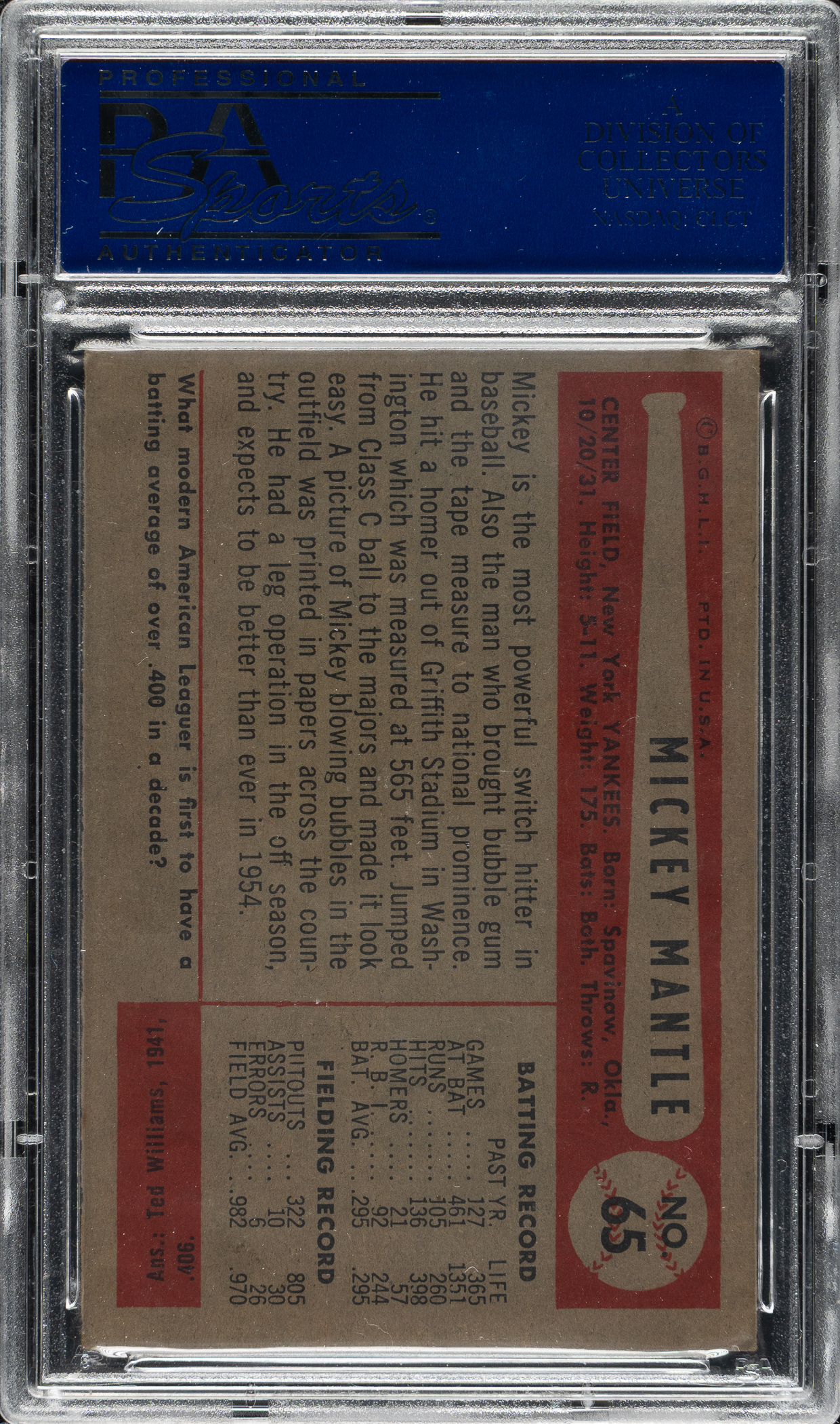 Lot # 1152: 1954 Bowman #65 Mickey Mantle PSA EX 5