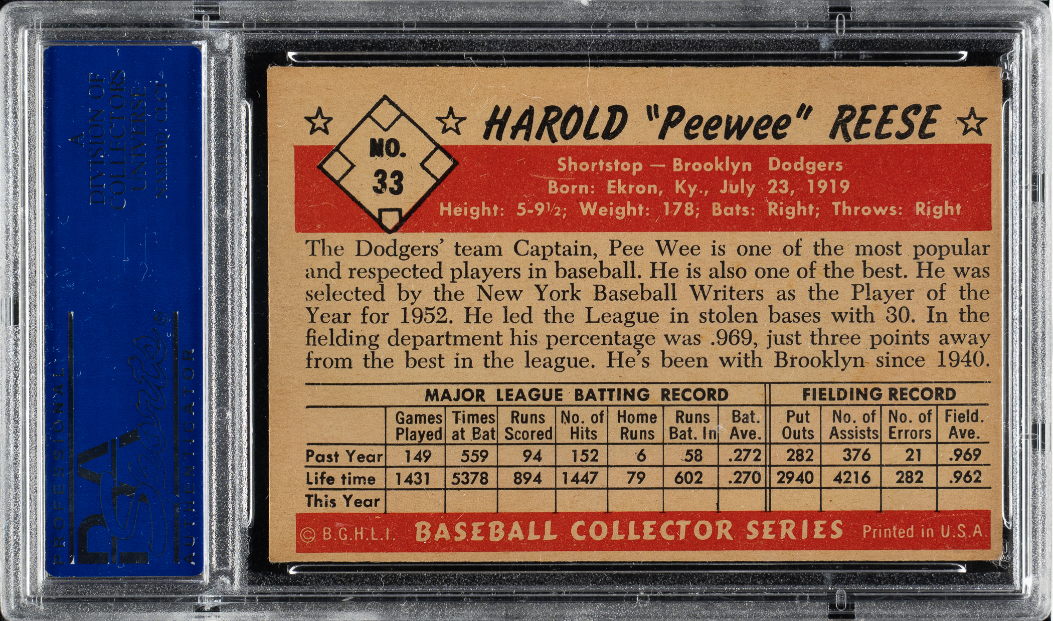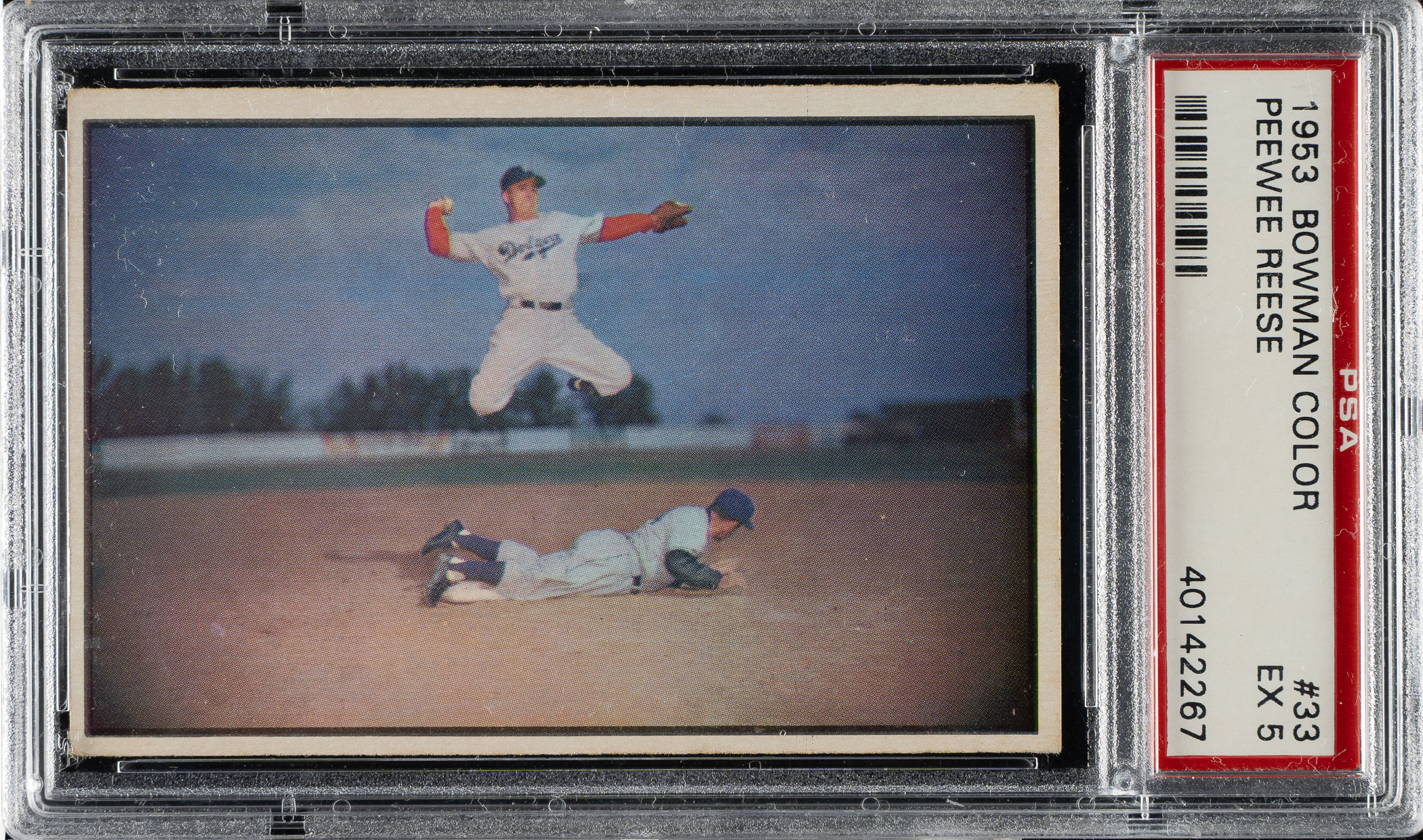 Graded EX 5 by PSA. Brooklyn Dodgers Hall of Famer Pee Wee Reese.