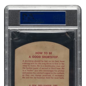 Graded EX 5 by PSA. Very attractive card featuring Brooklyn Dodgers Hall of Famer Pee Wee Reese from this scarce and distinctive early 1950s New York area regional issue. The "nooks and crannies" associated with the design of these die-cut cards make 1952 Coke Tips very condition-sensitive, and technically high-grade examples particularly rare. Though this card is technically a mid-grade example, exhibiting minor flaws that come with the territory with this issue due to their unusual shapes, this is an extremely bright and crisp card that has a superior appearance than suggested by its technical grade. The lower portion of the card features the home-game schedule of the Dodgers. The reverse features detailed playing tips. These unusual cards were issued one card per old-fashioned six-pack cardboard container of Coca-Cola, stuck in with the bottles. This is a strong mid-grade Hall of Famer example of this early 1950s regional issue, which receives little attention but has always been held in very high esteem by advanced collectors both for its extreme rarity as well as for its very striking and unique design.