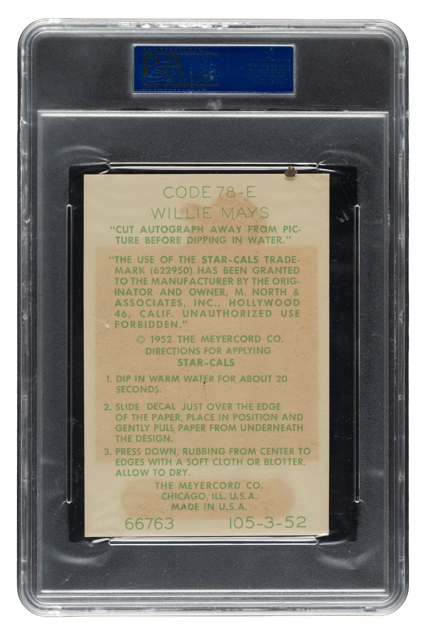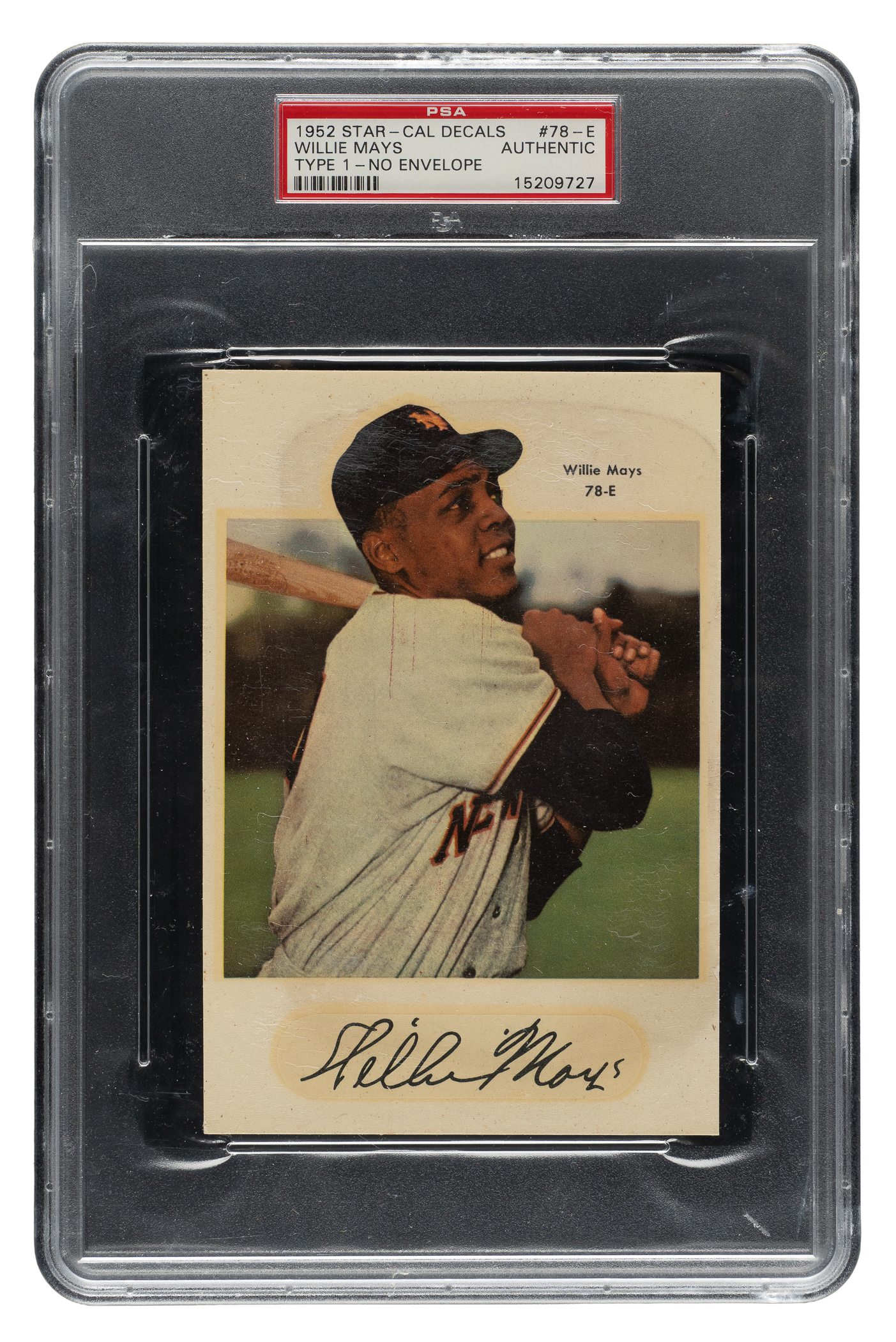 Rarely offered example of New York Giants Hall of Famer Willie Mays from the 1952 Star-Decals (Type 1) series. The decal has been removed from its original packaging envelope as issued. Produced by the Meyercord Co. of Chicago in 1952, the Type 1 Star-Cal set consists of 70 different major leaguers, each pictured on a large decal (4-1/8 x 6-1/8 inches) with a facsimile autograph below his image. Encapsulated as Authentic by PSA, the decal is bright and crisp with several wrinkles.