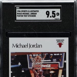Graded MINT+ 9.5 by SGC. This is the ONLY example graded at this level by SGC with none higher! Outstanding example of Michael Jordan from the 1986-1987 Sports Illustrated Poster Test Stickers series. Jordan highlights this 20-card multisport issue, which also includes Magic Johnson, Larry Bird, Lawrence Taylor, and Wade Boggs. This example boasts vibrant colors, superb image quality, and sharp corners. The blank reverse is clean. This is a spectacular example of this desirable and rarely offered Jordan piece.