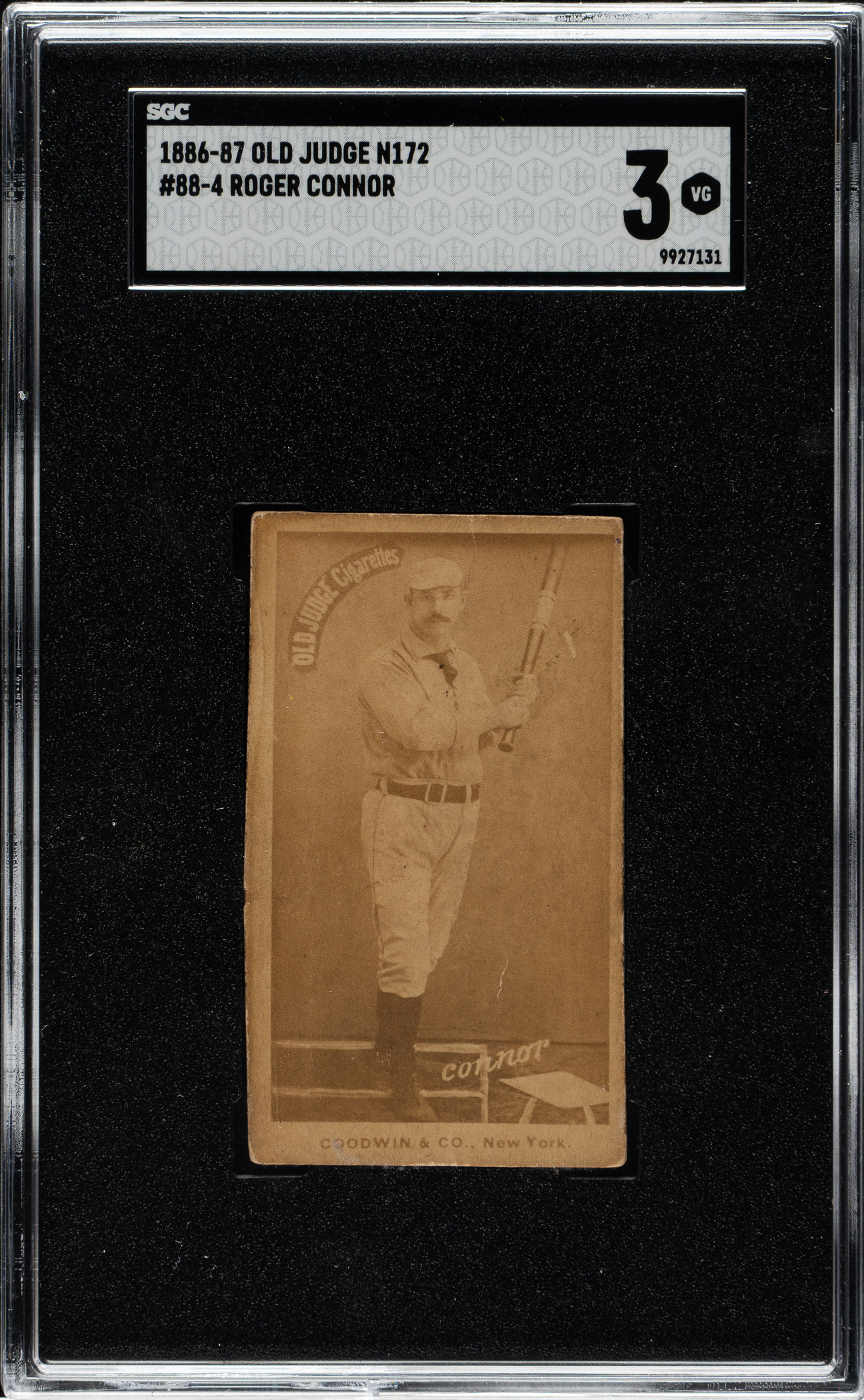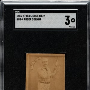 Graded VG 3 by SGC. Scarce and desirable "script series" N172 Old Judge card of Hall of Famer Roger Connor of the New York Giants (pose #88-4). We believe the distinctive "script series" cards were issued in 1886 (although it is possible they date from early 1887). According to The Photographic Baseball Cards of Goodwin & Company (1886-1890), the definitive book on Old Judges by Jay Miller, Joe Gonsowski, and Richard Masson, Connor ranks as the 10th rarest Hall of Famer (out of 28) in the entire N172 set. Connor was one of the greatest sluggers of the 19th century. His 138 career home runs stood as the record until Babe Ruth exceeded it. The card displays honest corner wear, a small surface indentation on the left edge, and centering to the right. The back of the card is soiled and several light surface wrinkles are visible.