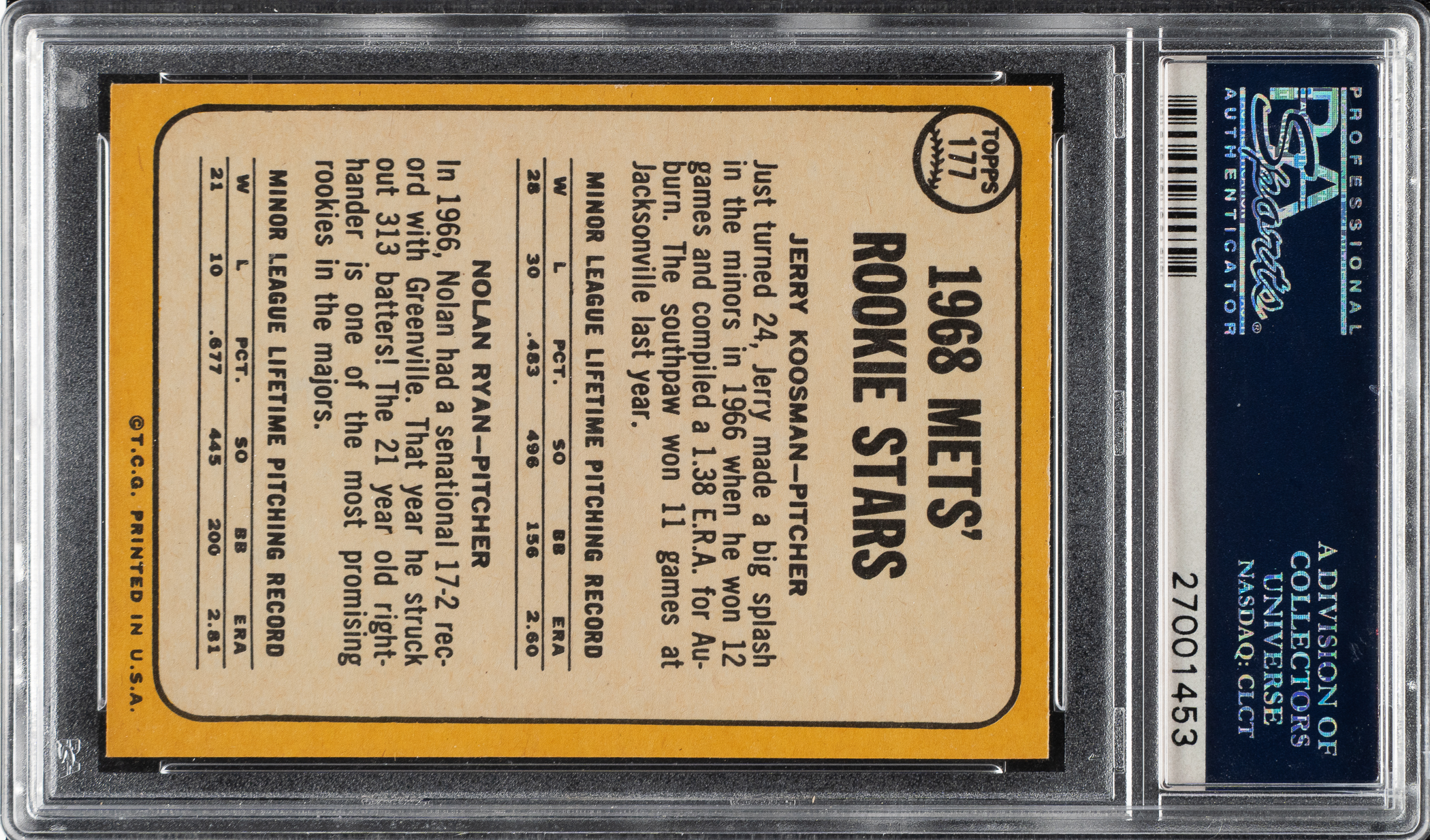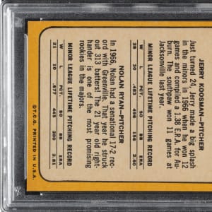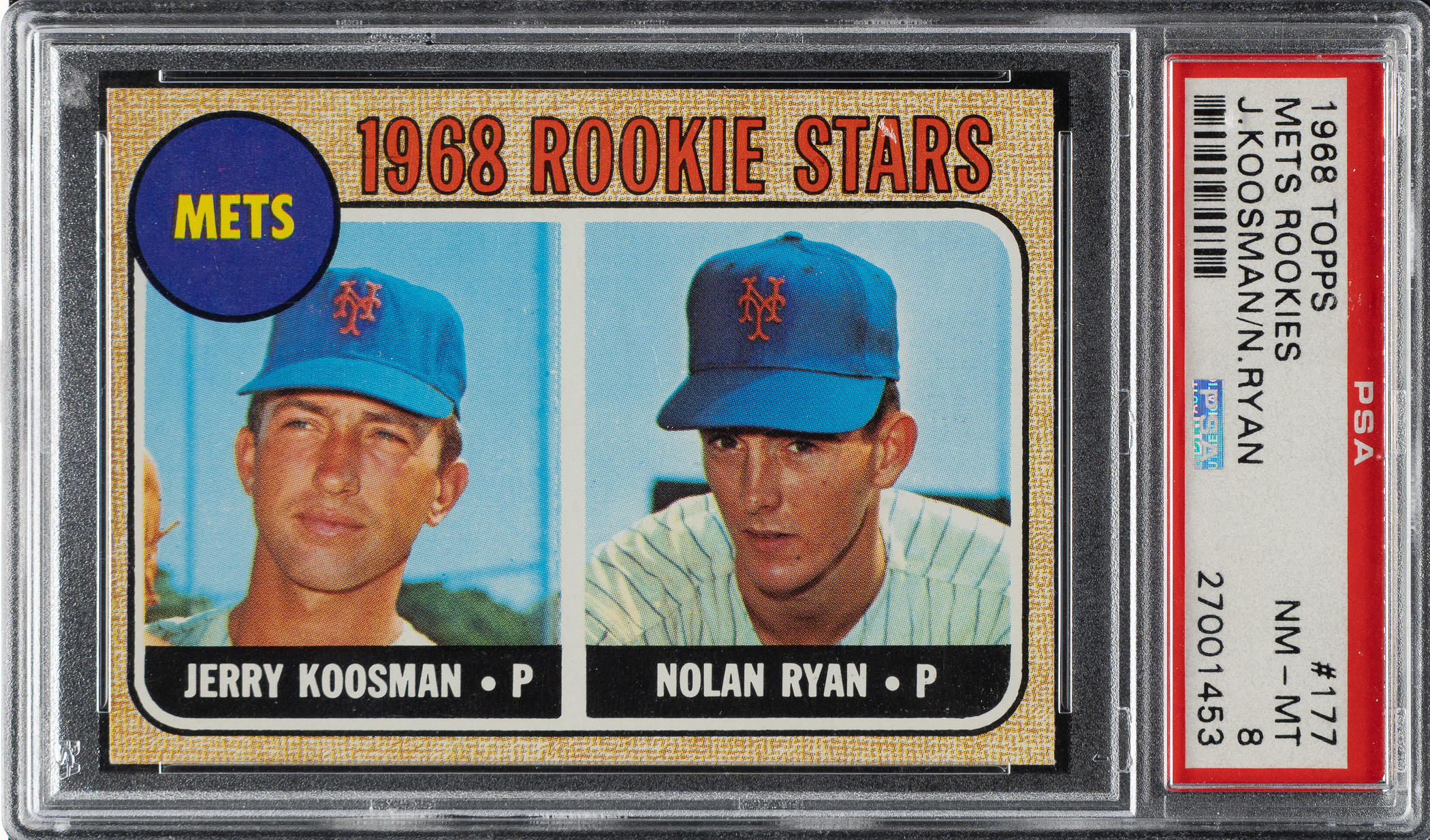 Graded NM-MT 8 by PSA. Outstanding high-grade rookie example of New York Mets Hall of Fame pitcher Nolan Ryan, one of the keys to the 1968 Topps set and one of the most famous of all Topps cards. This example has bold colors, superb image quality, and strong corners. The reverse is clean and boldly printed. A fantastic example of one of modern card collecting's classics.