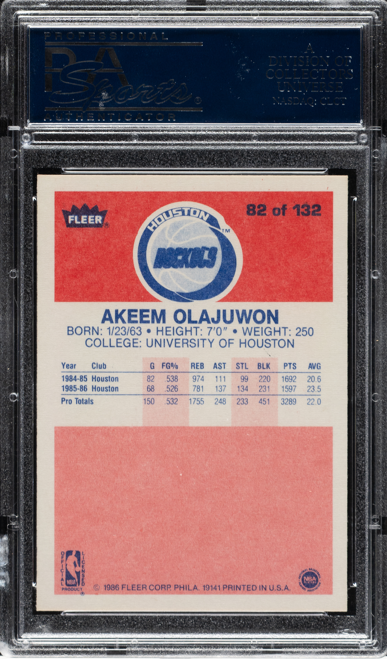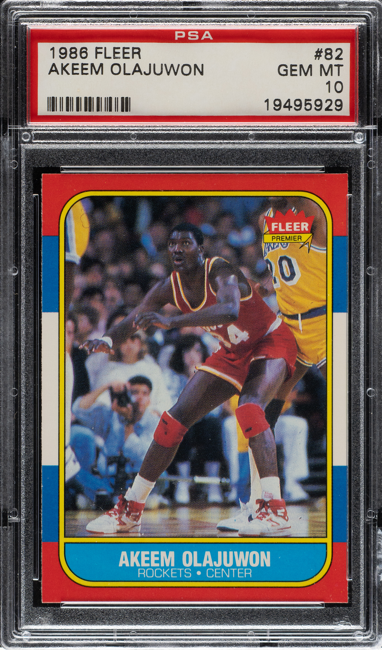Graded GEM MINT 10 by PSA. Ultra-high-grade rookie card of Hall of Famer Akeem Olajuwon from the 1986-1987 Fleer basketball set. This card is a pack-fresh gem with a crisp image, sharp corners, and outstanding centering. This is a spectacular rookie card example of this popular Houston Rockets legend.