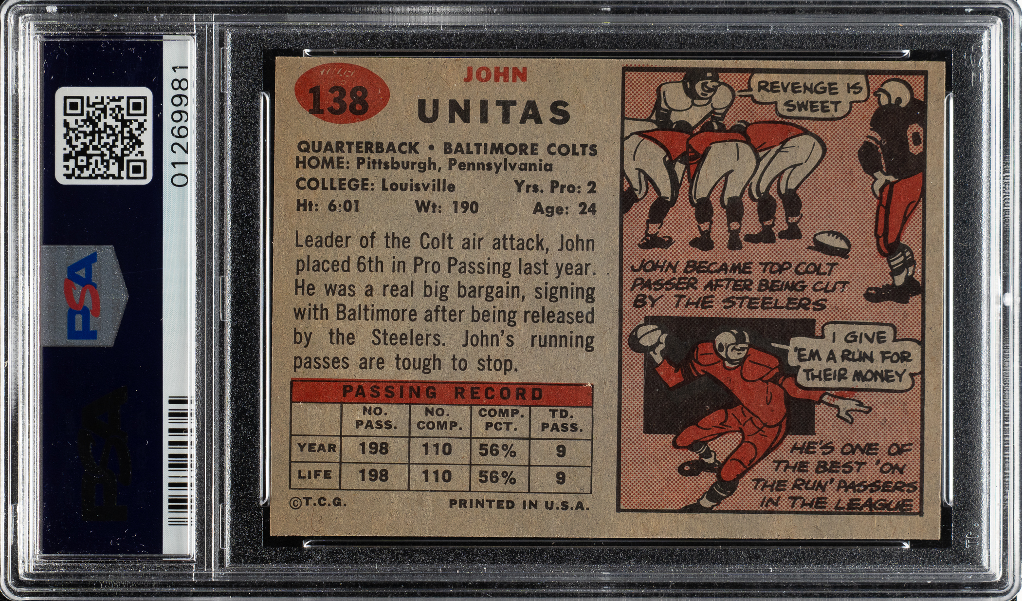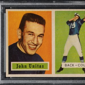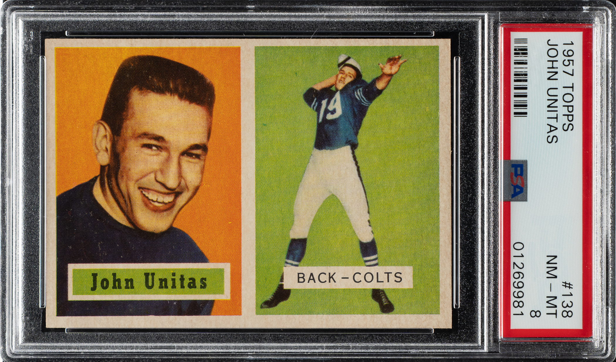 Graded NM-MT 8 by PSA. High-grade rookie card of Baltimore Colts Hall of Fame quarterback Johnny Unitas, one of football-card collecting's great classics. The offered card boasts bright colors, a crisp image, and strong corners. Clean reverse. High-grade example of Unitas' most popular card and one of the key cards from the 1957 Topps football set.