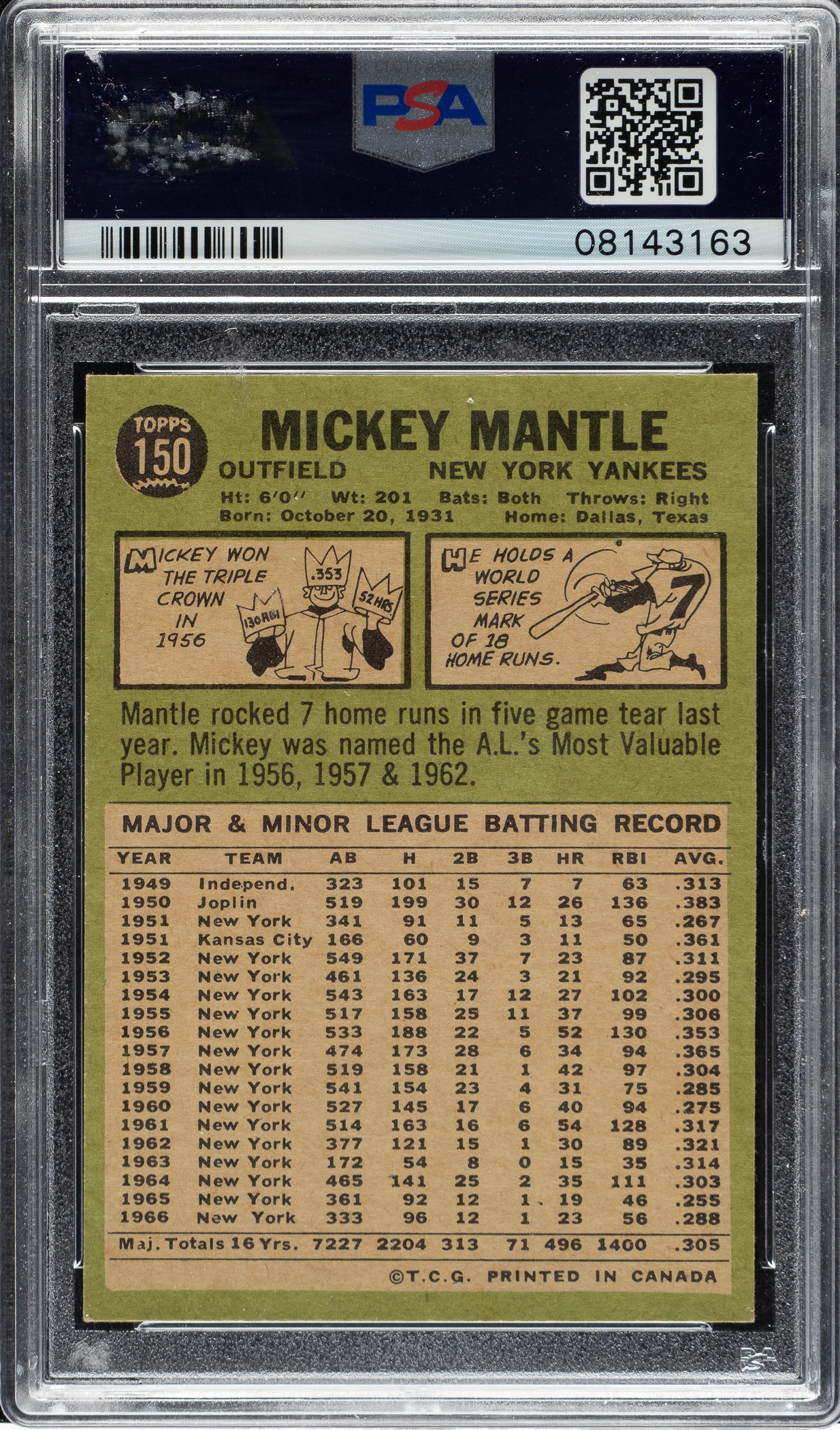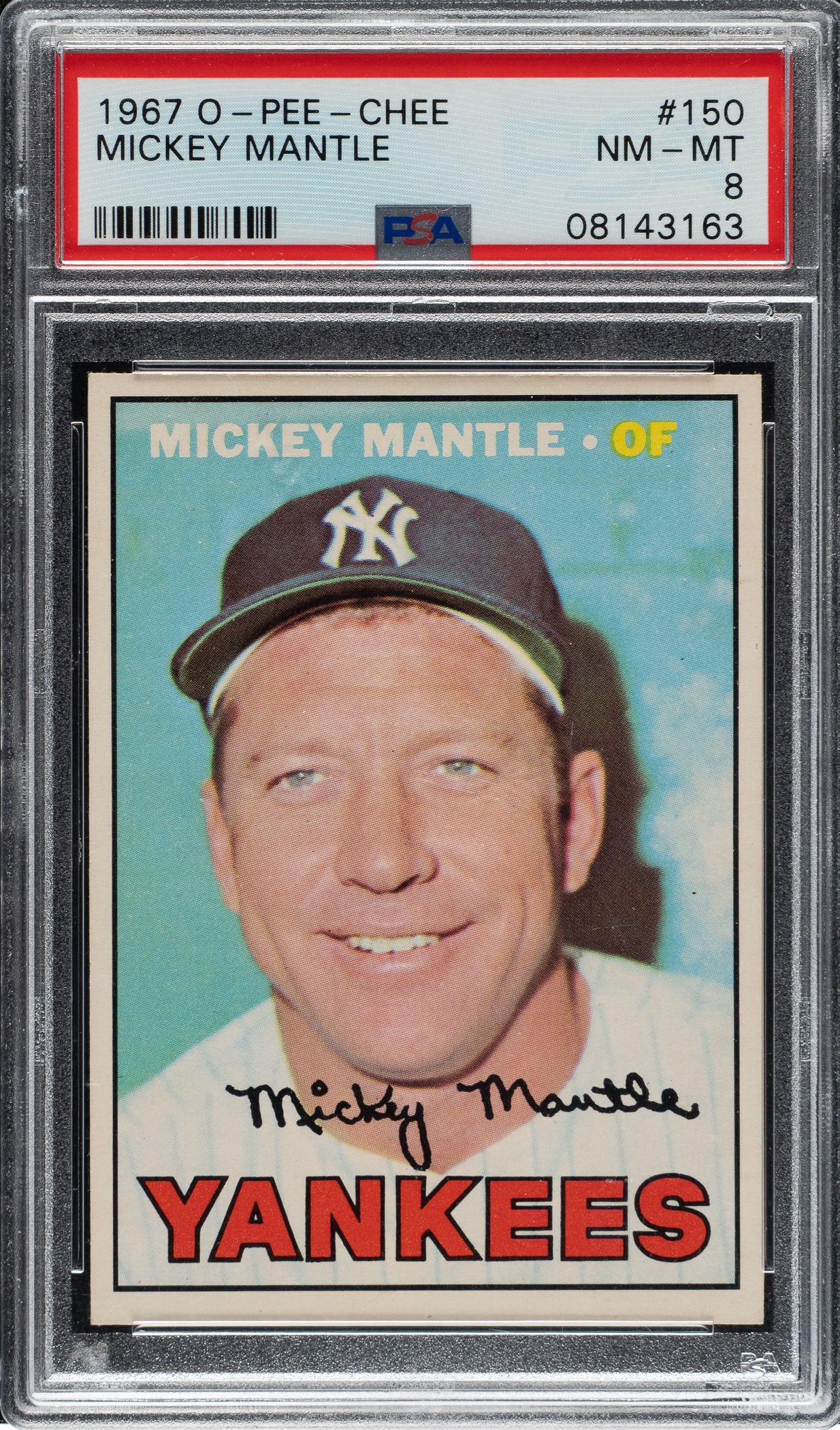 Graded NM-MT 8 by PSA. Highest-graded example! Extremely attractive ultra-high-grade example of New York Yankees Hall of Famer Mickey Mantle from the 1967 O-Pee-Chee set. Featuring the exact same poses and information as the standard Topps cards from the same year, O-Pee-Chee baseball cards were issued regionally only in Canada and are much rarer than their American counterparts. The offered card is particularly clean and crisp with a flawless image and four strong corners. Clean reverse. An outstanding opportunity to add this elusive Topps-related classic card (especially in such high grade) to any Mickey Mantle, O-Pee-Chee, or Hall of Fame card collection.