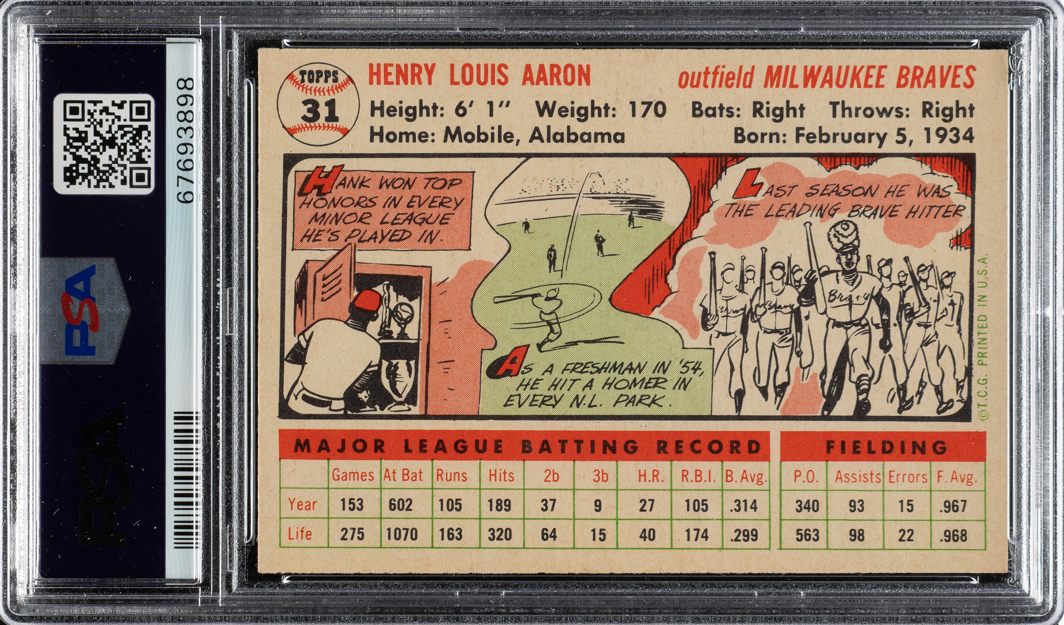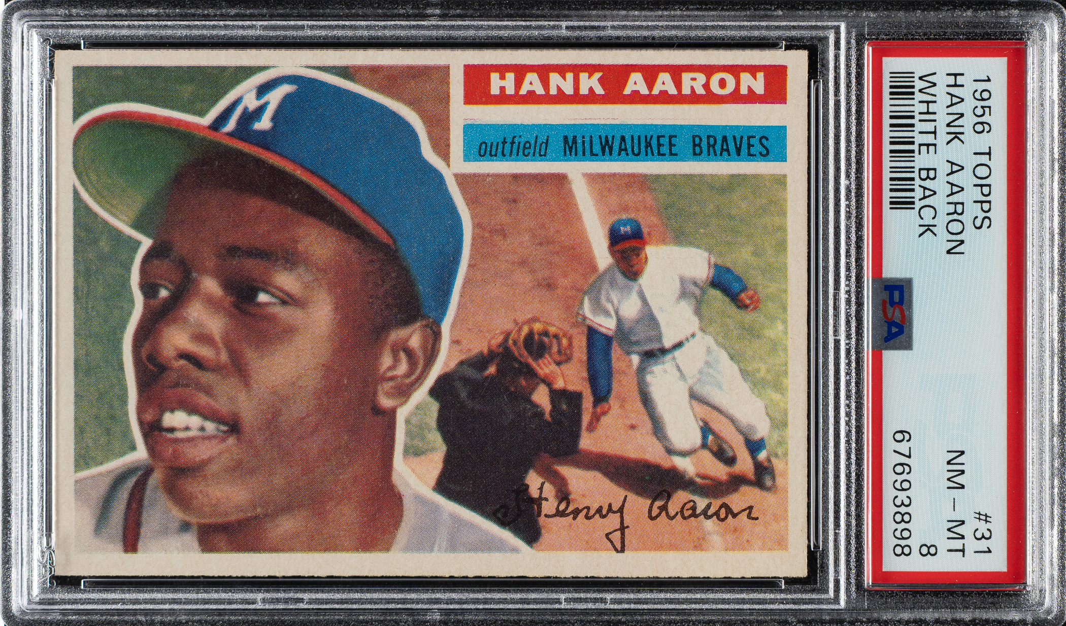 Graded NM-MT 8 by PSA. Tremendous high-grade example of Milwaukee Braves Hall of Famer Hank Aaron from the classic 1956 Topps set. This example has brilliant colors, outstanding clarity, and strong corners. It is interesting to note the image on the card of Aaron sliding home is actually that of Hall of Famer Willie Mays. The white back is boldly printed and clean. This is a fantastic high-grade example of one of Hank Aaron's most important early cards and one of the key cards in this popular set.