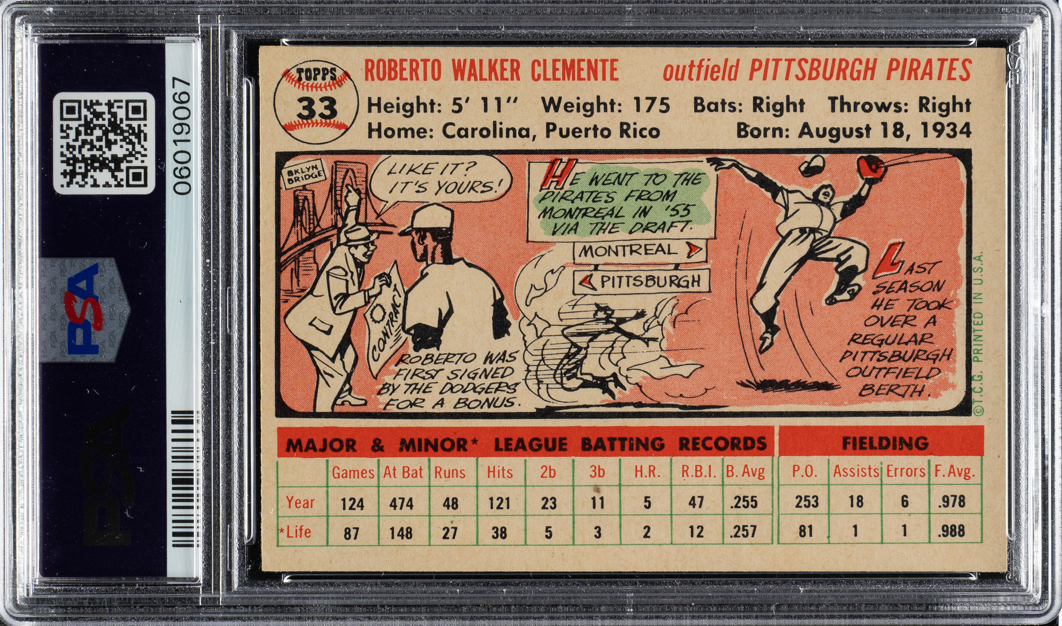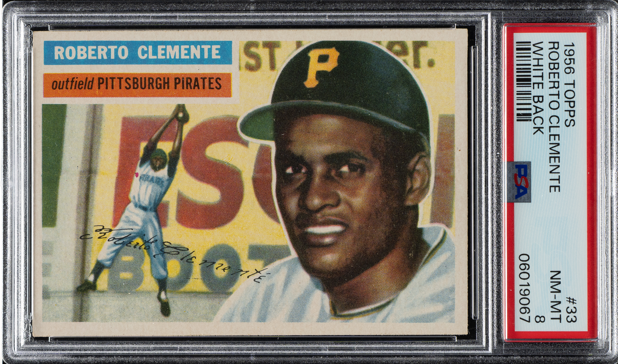 Graded NM-MT 8 by PSA. High-grade example of #33 Roberto Clemente (white back variety) from the classic 1956 Topps set featuring the Pittsburgh Pirates Hall of Famer in his second year in the Major Leagues. The card has brilliant colors, a crisp image, and strong corners. Clean reverse.