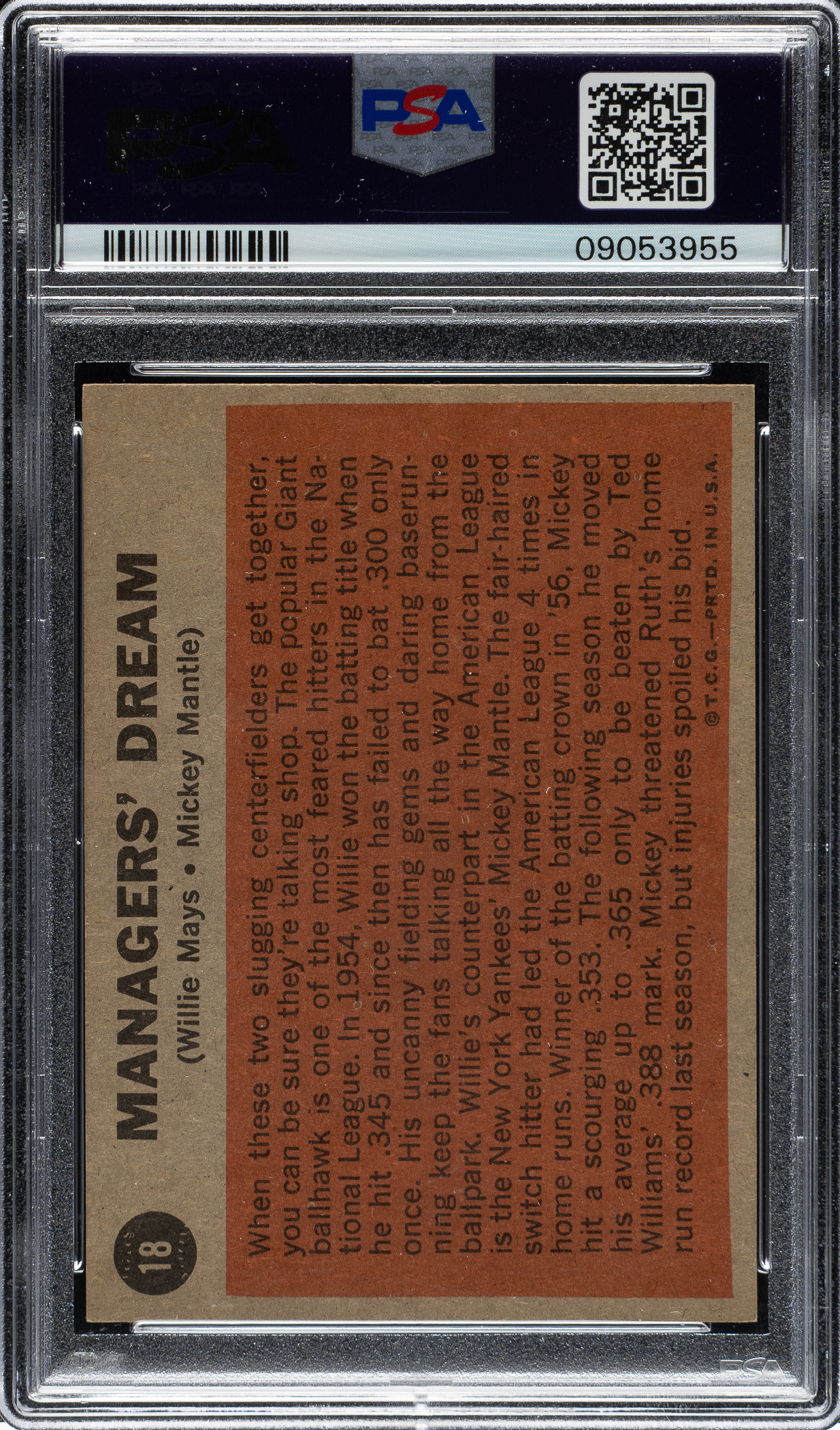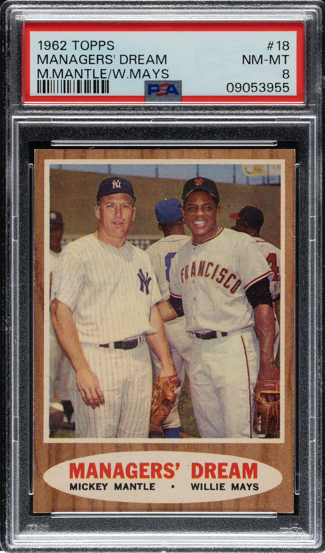 Graded NM-MT 8 by PSA. Exceptional high-grade example of 1962 Topps #18 “Managers’ Dream” featuring Hall of Famers Mickey Mantle and Willie Mays. This card has always been a very difficult card to find in anything even resembling high grade. This well-centered card displays superb image quality, strong corners, and minimal wear on the condition-sensitive edges. Clean, boldly printed reverse. An outstanding high-grade example of one of the signature cards from the 1962 Topps set.