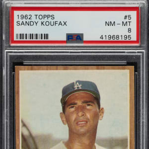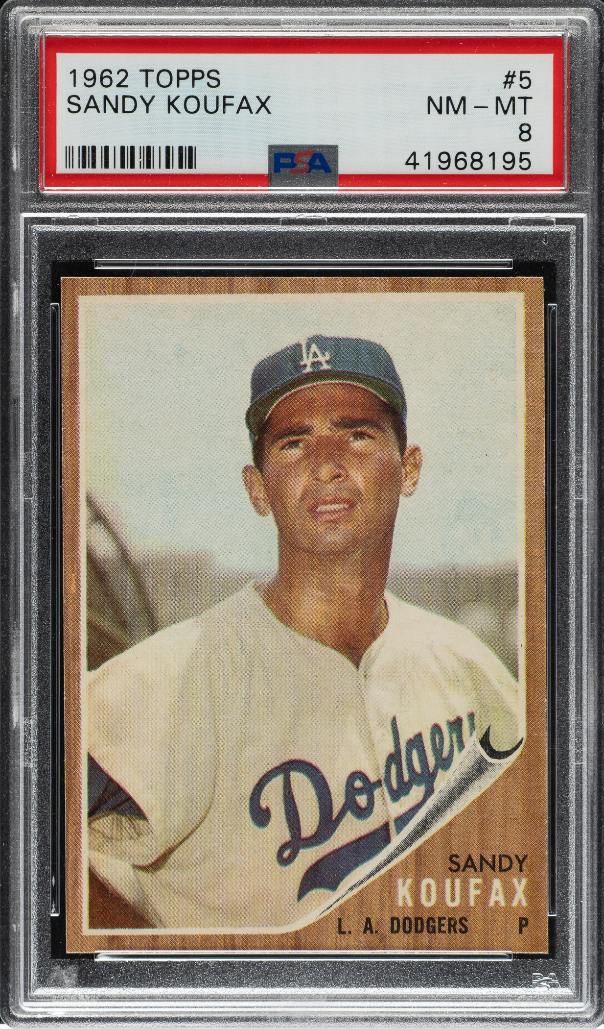 Graded NM-MT 8 by PSA. Beautiful high-grade example of Los Angeles Dodgers Hall of Famer Sandy Koufax from the 1962 Topps set. This card has a crisp image, strong corners, and virtually no chipping along the delicate wood-grain borders. Clean reverse.