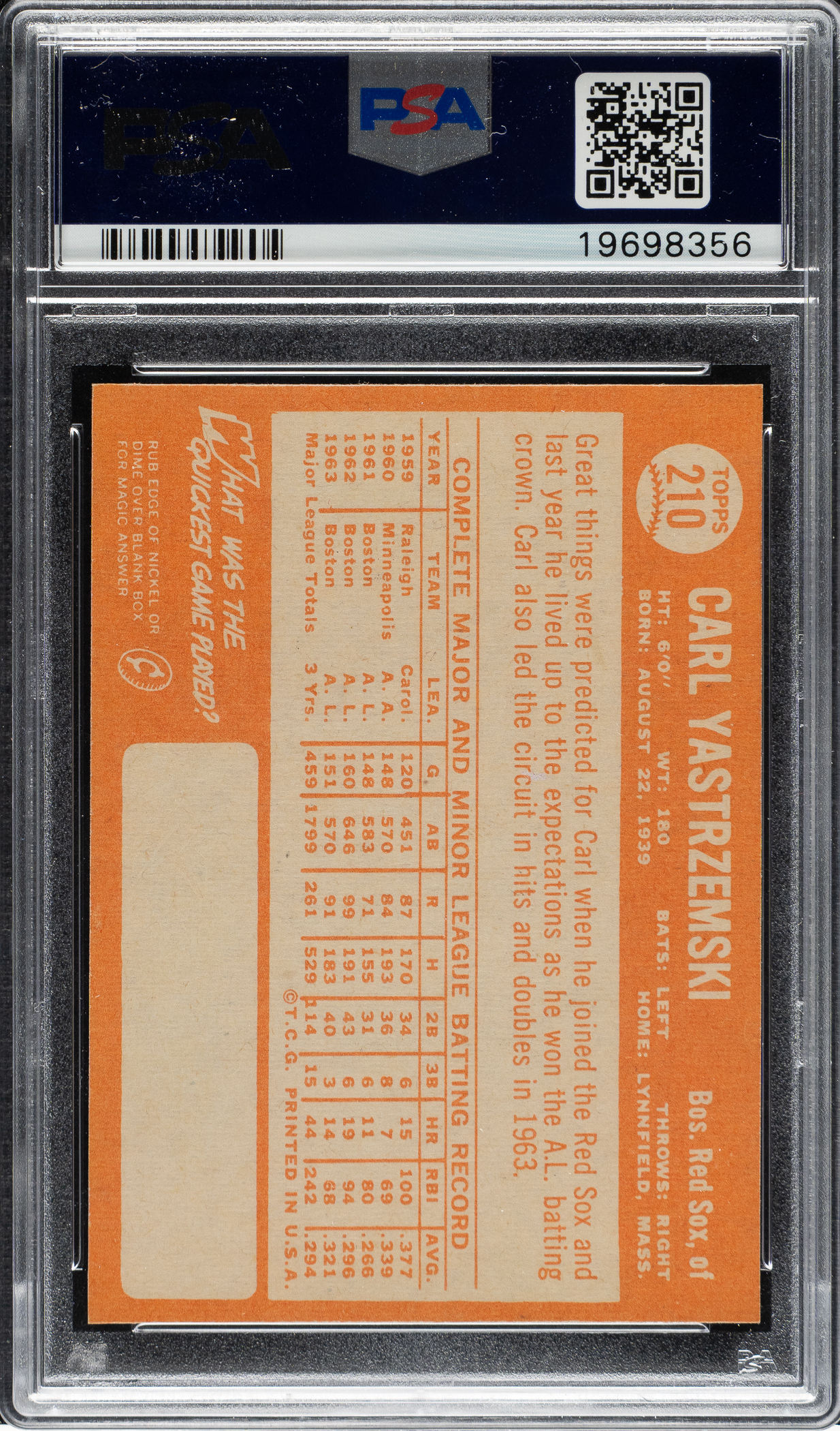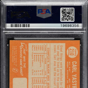 Graded MINT 9 by PSA. Boston Red Sox Hall of Famer Carl Yastrzemski. Only three examples grade higher out of 2,612 cards evaluated by PSA.