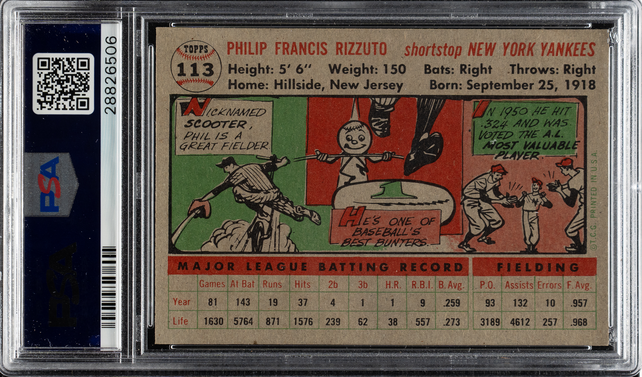 Graded NM-MT 8 by PSA. New York Yankees Hall of Famer Phil Rizzuto.