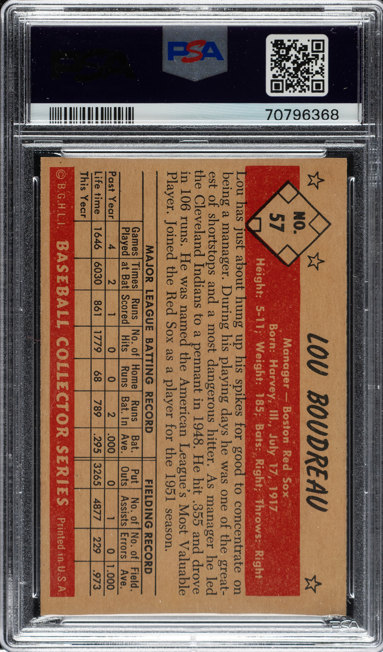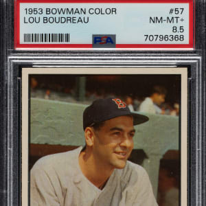 Graded NM-MT+ 8.5 by PSA. Boston Red Sox Hall of Famer Lou Boudreau.
