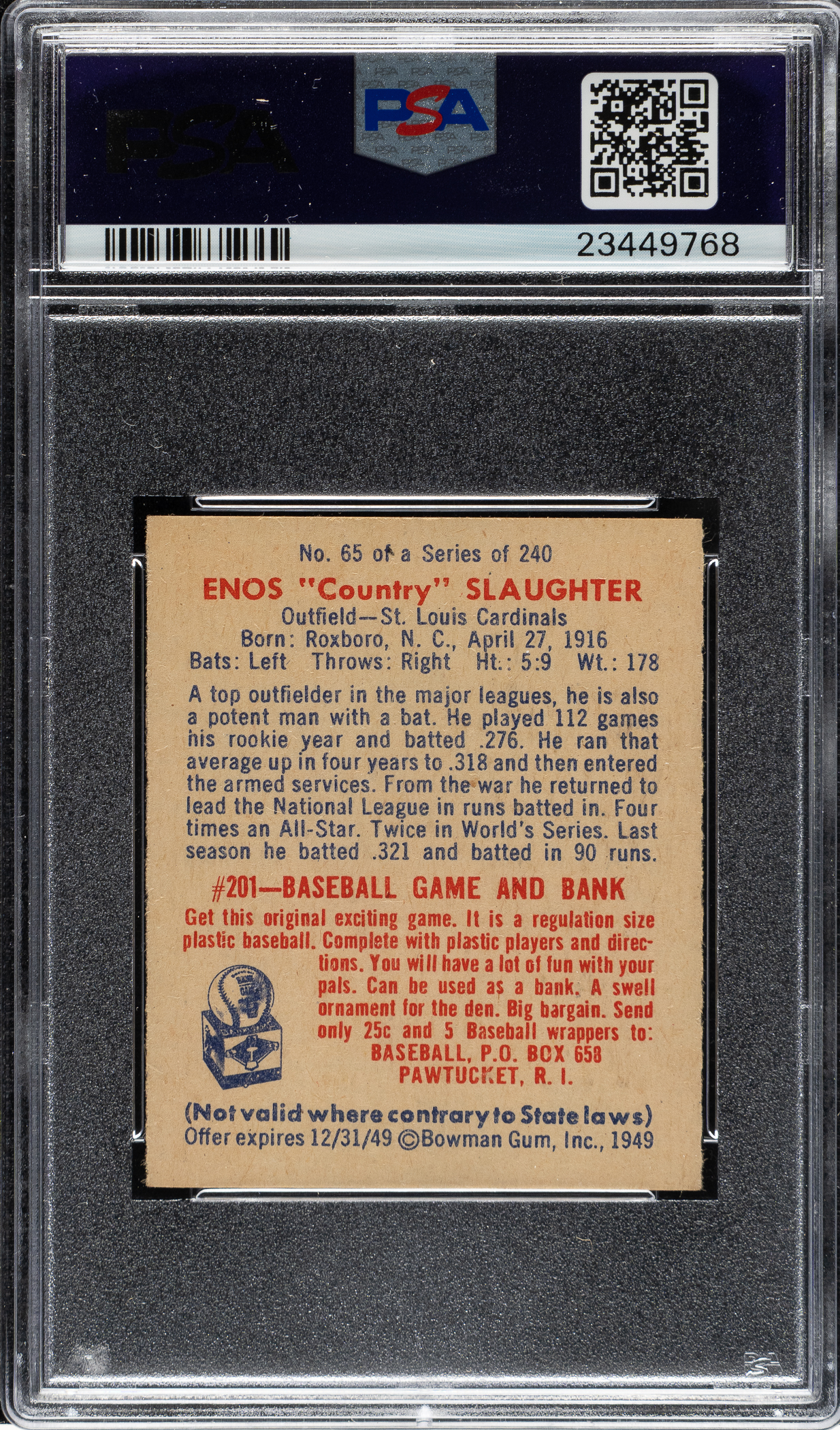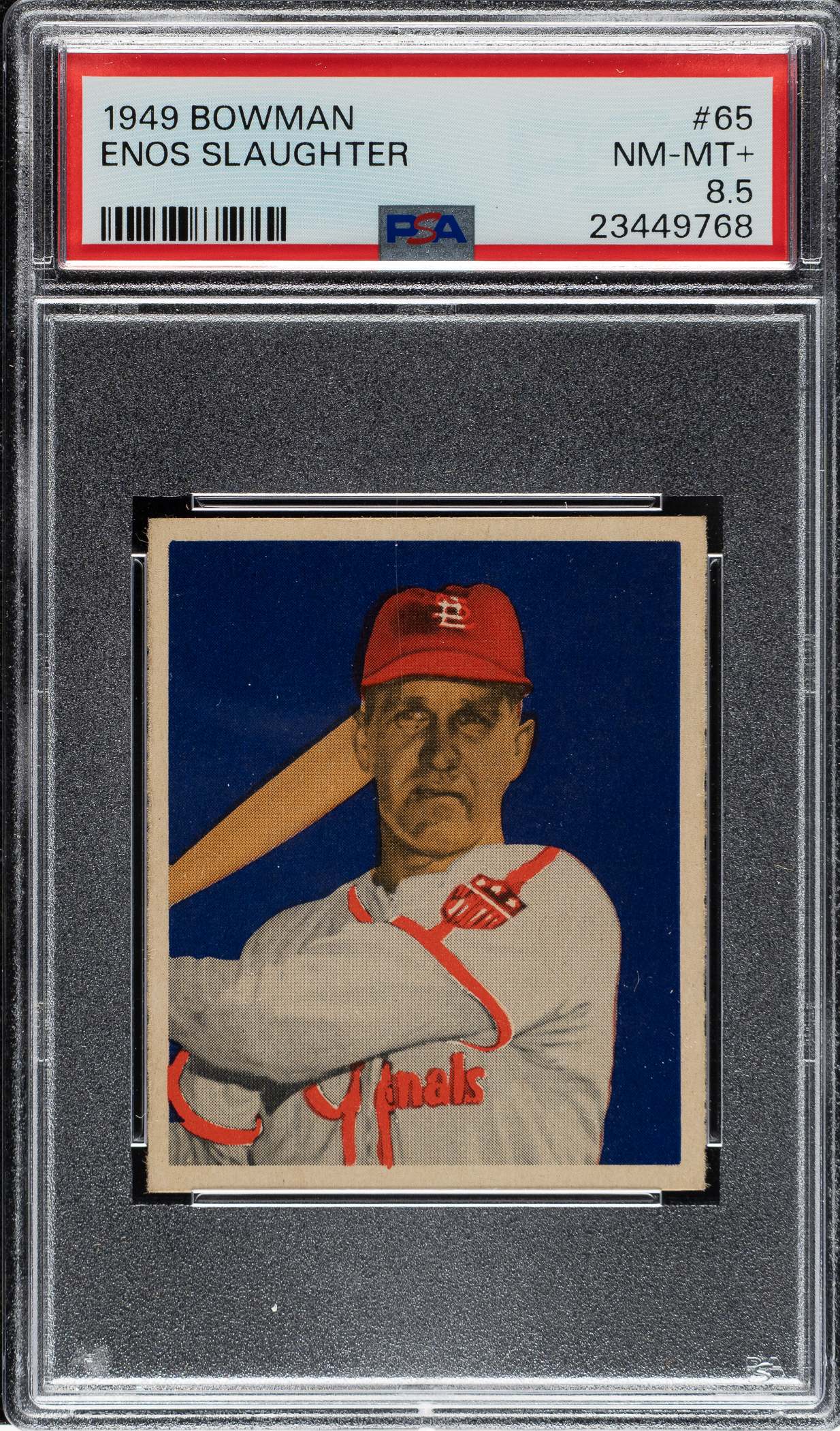 Graded NM-MT+ 8.5 by PSA. St. Louis Cardinals Hall of Famer Enos Slaughter.