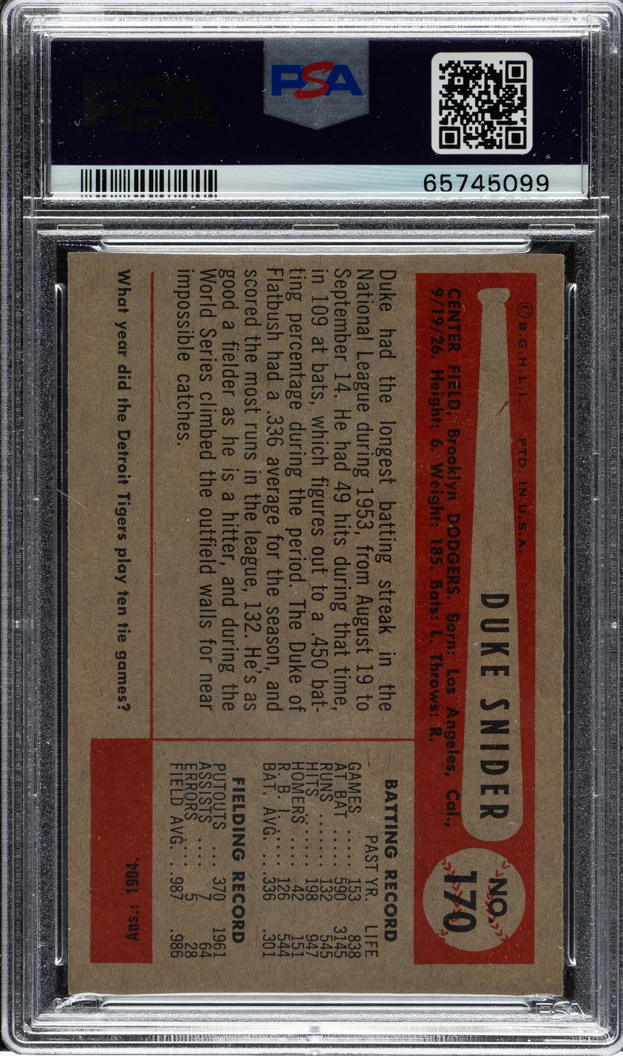 Graded NM-MT 8 by PSA. Brooklyn Dodgers Hall of Famer Duke Snider.