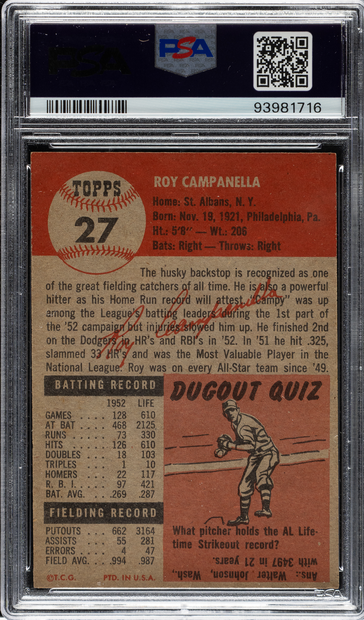 Graded NM-MT 8 by PSA. Brooklyn Dodgers Hall of Famer Roy Campanella.